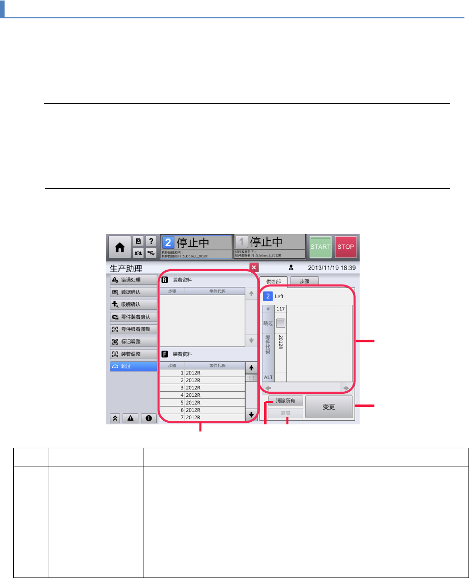 在[跳过]画面中,可确认生产时的跳过设定状态,更改生产停止时的跳过设定。