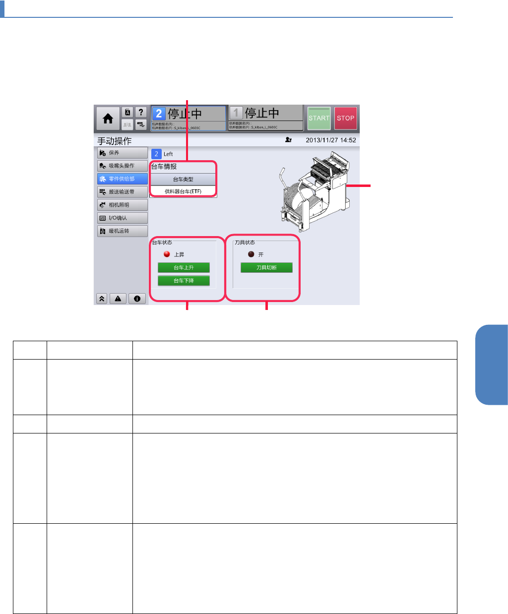 显示装置的零件供给台车的上升/下降状态,通过分组中的按钮上升/下