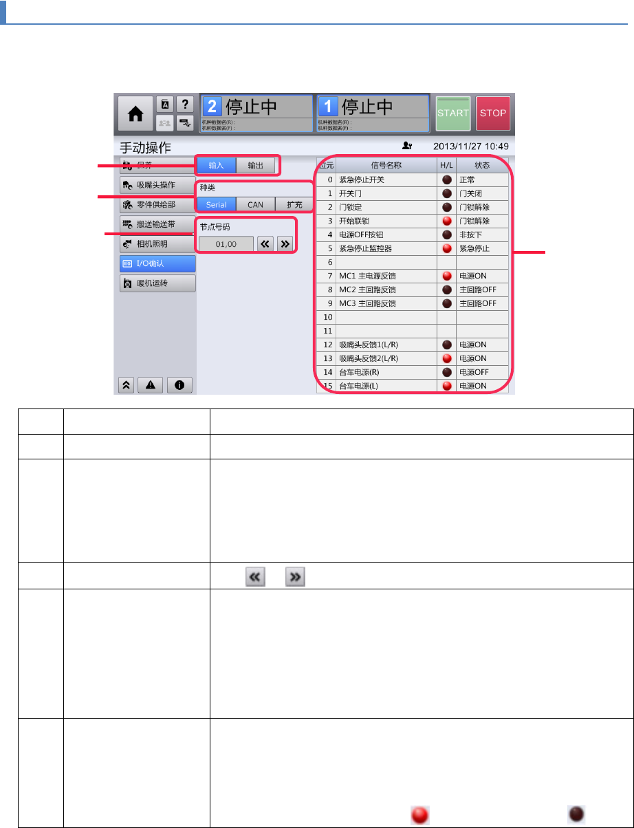第 4 章 操作篇 4- 9. 手动操作 4 记号 名称 说明 (f) I/O 状态列表 将 I/O 的状态分为[位元] ,[信号名称 ],[ H/L ] ,[状态] 列表显示。 • 位元 :在 0 ~ 15 之 前显示 I/O 的位编号。 • 信号名称:显示 I/O 的信号名称。 • H/L : I/O 状态为 High (1) 时显示( ), Low (0 ) 时显 示( )。 • 状态 :显示 I/O 当前状态的含义。 输入 / …