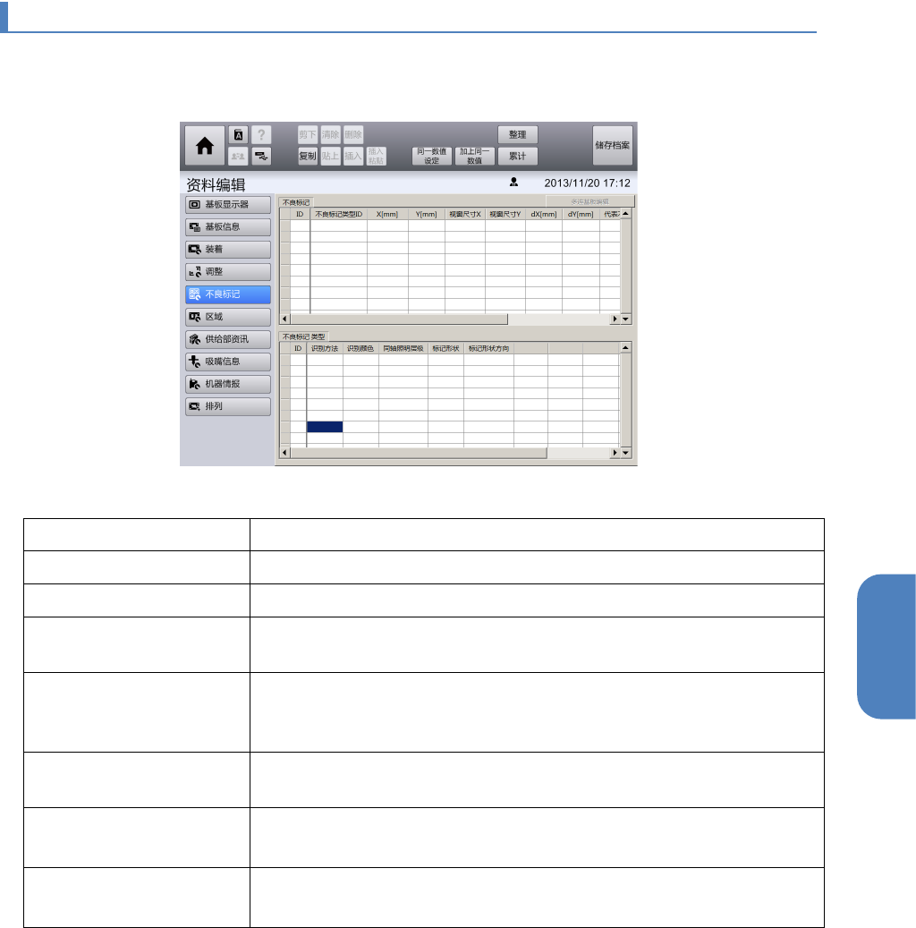 触摸[数据编辑]菜单画面左侧的子菜单面板中的[不良标记],显示[不良标记]画面。