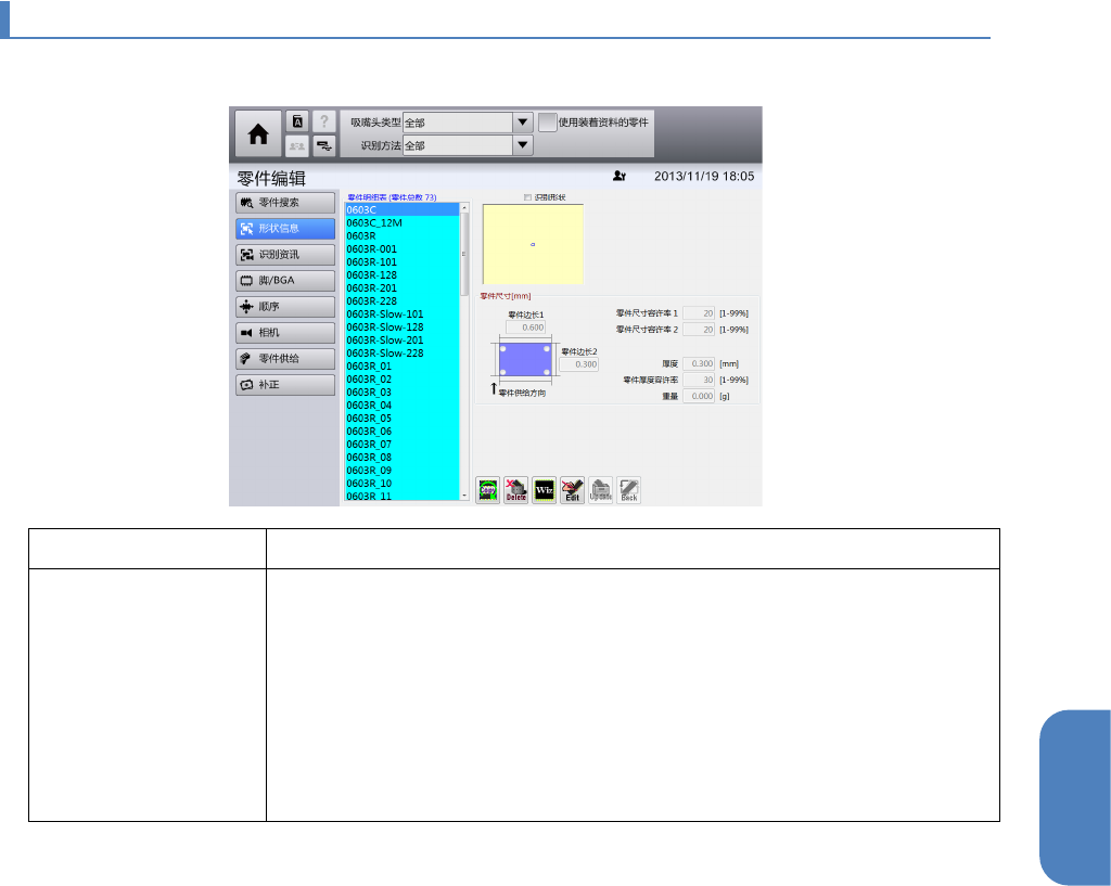 可显示和编辑本机零件资料库中记录的零件数据之识别参数。