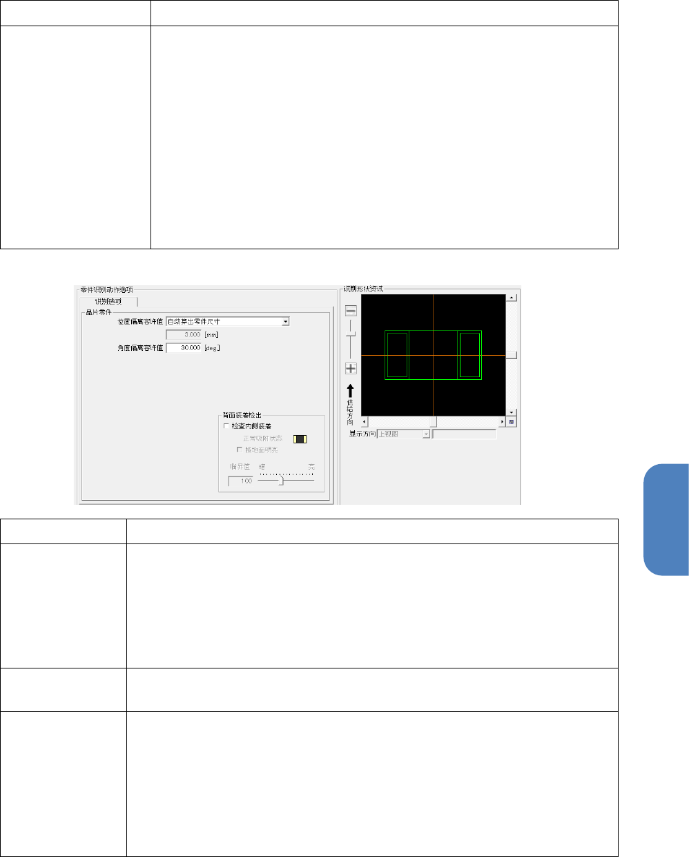 第 4 章 操作篇 4- 13. 零件生成向导 4-13-5. 零件识别选项画 面 选择识别测试选项卡 名称 说明 吸着偏离测试 选中本项目后, 将以旋转中心 角度作为零件应有的 角度固定,只 旋转实际 零件来进行识别 ,可验证针对 吸附时零件偏移的稳 定度。 零件旋转测试 选中本项目后, 在统一零件应 有的角度和实际零件 的角度后进行 旋转并识 别,可在生产时 验证零件角度 的识别性。 旋转中心角度 旋转零件的同时进行识别时, 设…
