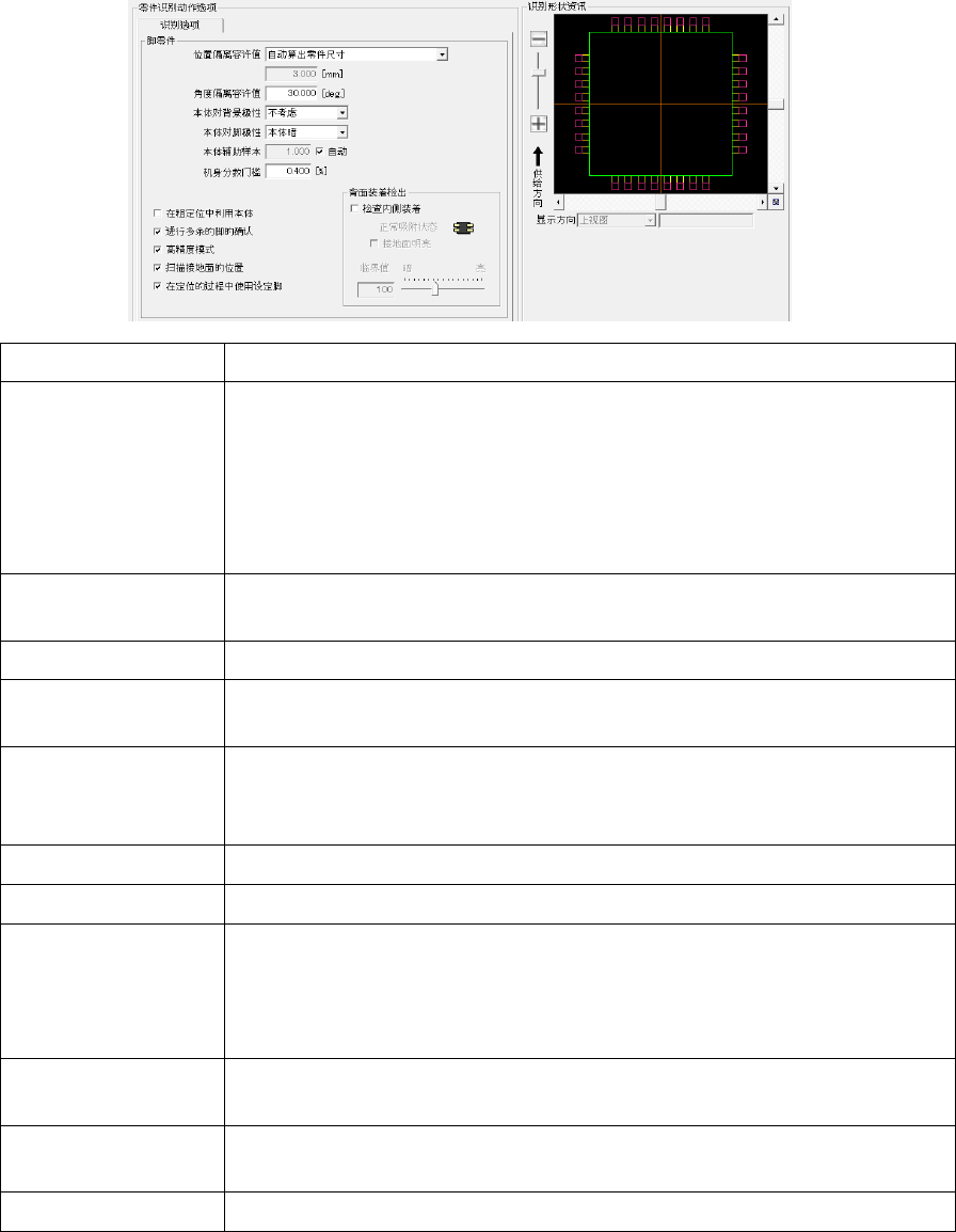 第 4 章 操作篇 4- 13. 零件生成向导 4 名称 说明 在定位的过程中 使用 设定脚 设定是否排列引 脚集合。 通常为选中。但 以下情况下取 消选中。 • 发生识别错误。 • 引脚集合重叠。 • 主体内存在引脚 集合。 高精度模式 设定是否在高精 度模式下测量 引脚前端。 背面装着检出 吸附零件 时,设定是否检测零 件的背面安装 (上下反转吸附的状 态)。 • 检查内侧装着: 选中后,将检 测背面安装的零件。 • 正常吸附状态:…