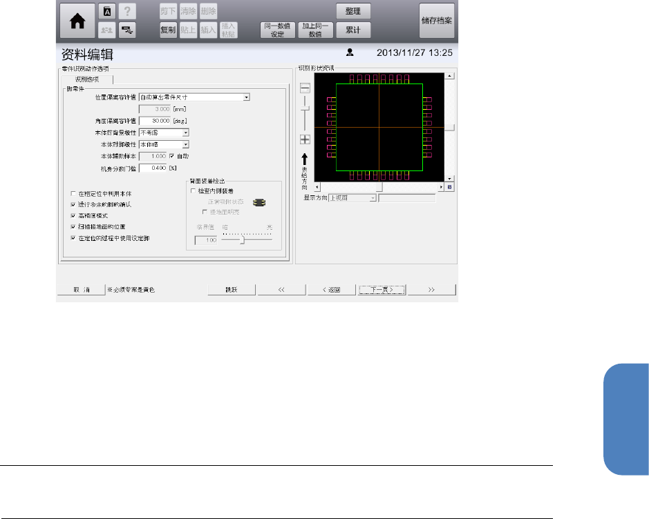 第 4 章 操作篇 4- 14. 数据创建步骤 23 触摸[下一页]。 显示吸附,废弃 画面。 24 触摸[零件废弃]的[放弃执行]。 为了从吸嘴上取 下识别到的零 件,进行废弃动作。 Tips • 本操作无法跳过 。 25 触摸[下一页]。 显示注册信息确 认画面。 触摸 [表示明细],显示注册 零件的详细信 息。 26 触摸[注册],注册零件。 结束零件生成向 导,返回零件 编辑画面,零件注册 完成。 260