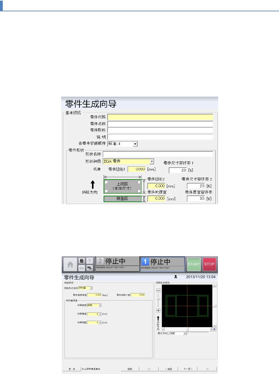第 4 章 操作篇 4- 14. 数据创建步骤 4-14-4. 创建 BGA 零件的 数据 1 输入[零件代码]。 输入任意的零件 名称,零件别 称及注释。 2 从[形状种类]的下拉列表中选择[ BGA 零件]。 3 输入零件长度。 触摸 [零件边长 1 (mm) ]和[零件边长 2 (mm) ]的文本框后输入。 4 从下拉列表中分别选择[使用相机]和[照明]。 5 触摸[下一页]。 显示 供给信息画面。 262