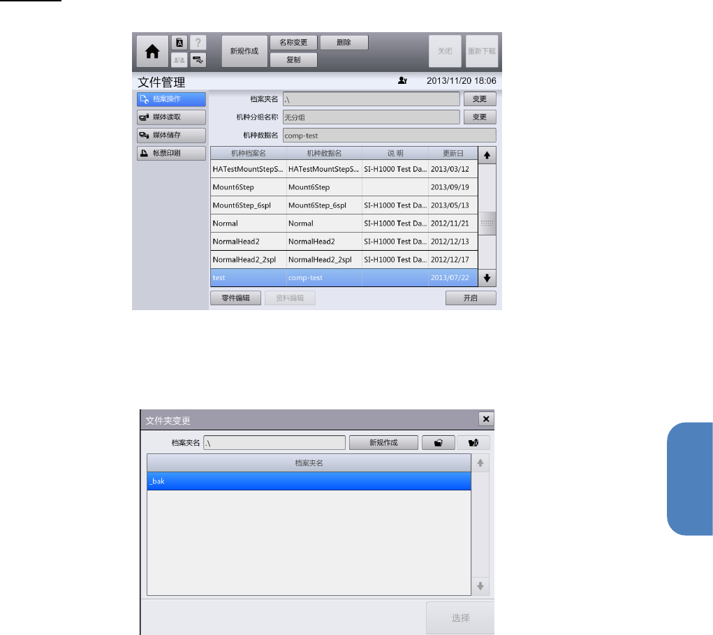 第 4 章 操作篇 4- 14. 数据创建步骤 4 编辑数据 在主菜单中按[ 文件管理] - [档案操作]的 顺序触摸后,将显示文 件操作画面。 1 触摸 [档案夹名] 右侧的 [变更] 。 显示 [文件夹变更]对话框。 有关 [文件夹变更]对话框的 详情,请参阅 “ 4- 10 - 2. 文件操作 ”的“文件夹更改对 话框”。 293