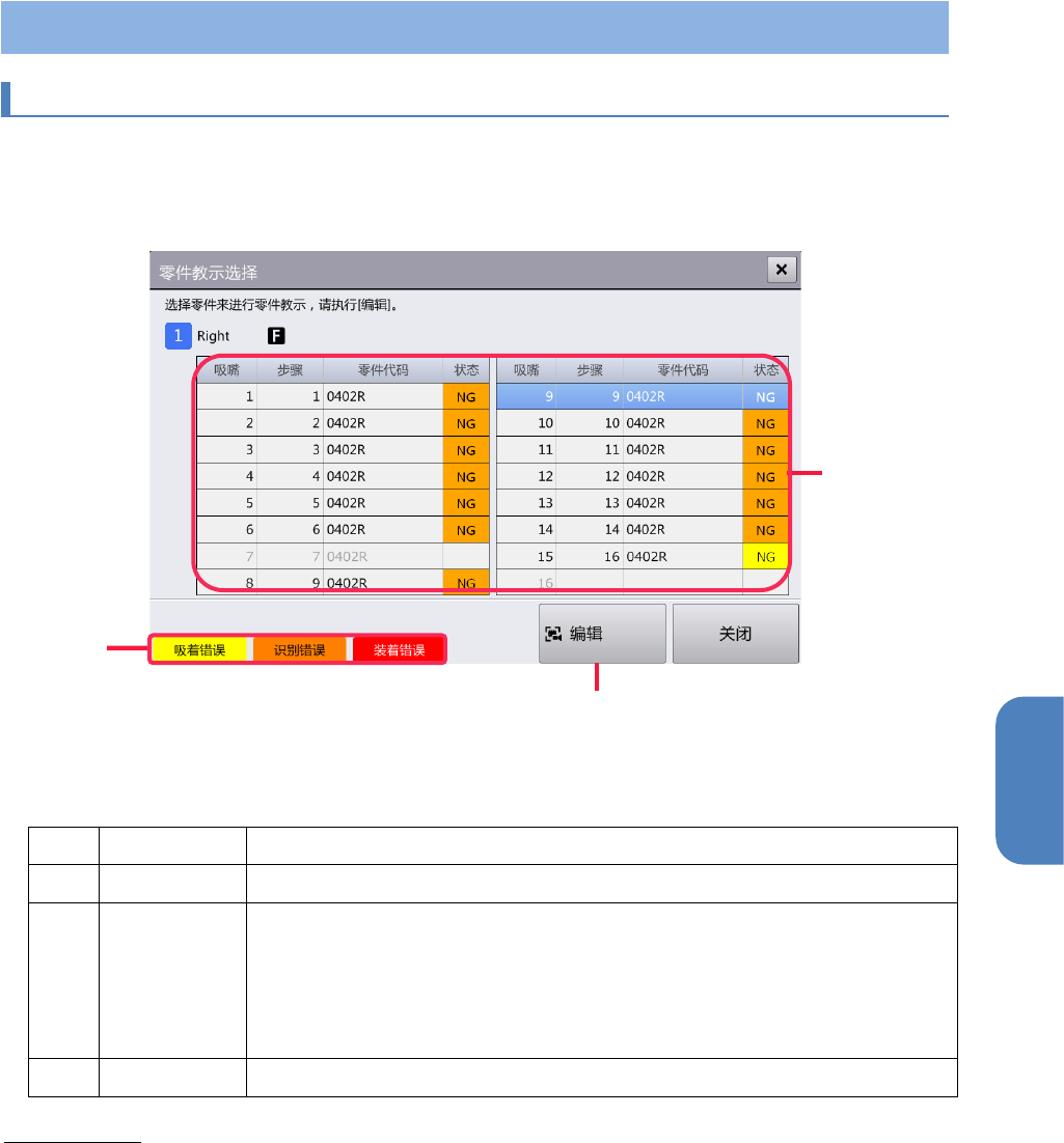 第 4 章 操作篇 4- 15. 示教 4 4- 15. 示教 4-15-1. 零件示教 在主菜单中按[ 生产助理] - [错误处理] - [零件教示]的 顺序触摸后,将显示 [零件教示选 择 * ]对话框。 对于自动生产中 使用的零件, 可单独修改与零件识 别相关的数据 。 记号 名称 说明 (a) 零件选择列表 选择进行示教处理的零 件。 (b) 调色盘 显示零件 选择列表中状 态栏背景颜色的含义 。 • 吸着错误:黄色 (吸附错误…