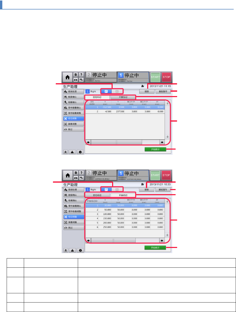 第 4 章 操作篇 4- 15. 示教 4-15-3. 标记调整 测量机种数据的 安装数据中设 定的定位标,不良标 记在基板上的 位置,在作为基板相 机目标位置进 行修 正的示教作业中 ,可确认并搜 索显示测量对象标记 数据,设置测 量用的基板。 触摸生产助理菜 单中的[标记 调整],显示标记调 整画面。 [标记调整]在 用户级别为[ 管理员]或[维护] 时显示。 触摸共用面板选 择对象装置, 画面左上方将显示选 择的装置。 [定位…