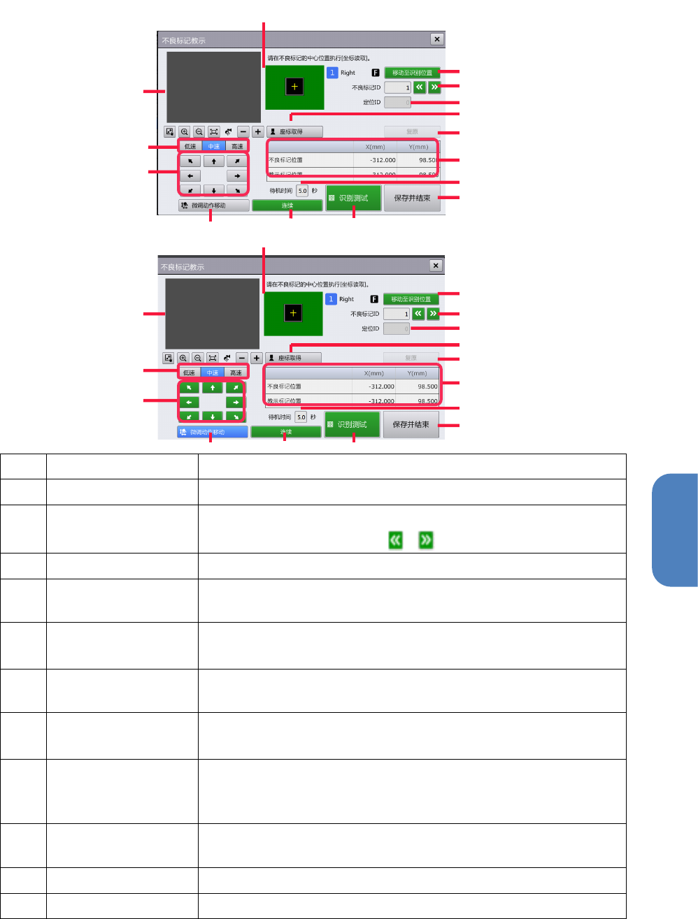 第 4 章 操作篇 4- 15. 示教 记号 名称 说明 (l) 连续 连 续显示不良标记的中 心位置。 (m) 待机时间 输入操作 [连续]时各 个点上相机的待机时 间。 可输入 0 ~ 9.9(sec) 的值。 (n) 识别测试 显示 [不良标记识别测试]对 话框,可进行 定位标的识别测试, 或 调整识别参数。 (o) 保存并结束 将 示教结果反映到机种 数据中,然后 关闭对话框。 1 在标记调整画面中触摸共用面板的装置按钮,选择进…