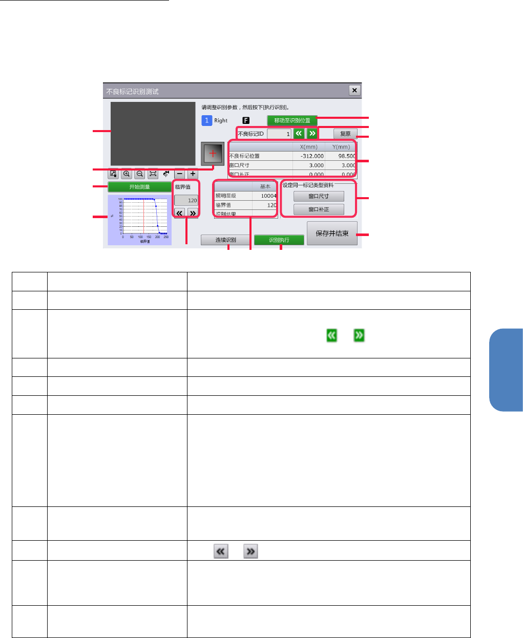 (g) 识别结果列表 显示不良标记识别参数中的照明级别,分数值和阈值。