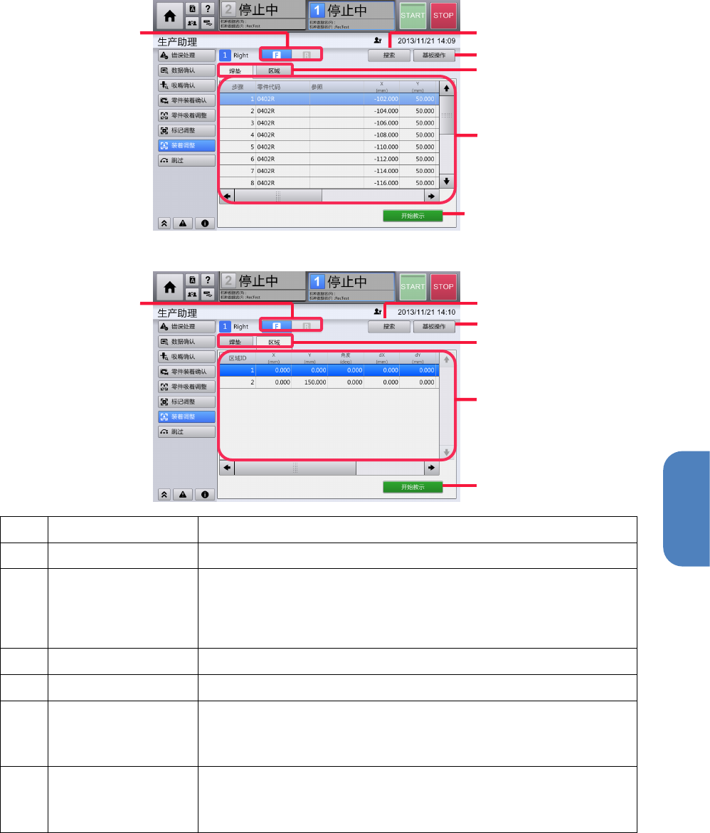 第 4 章 操作篇 4- 15. 示教 4 在坐标值列表,识别结果列表中输入不发生错误的条件,重复步骤 3 到 4 。 关于输入不发生 错误的条件, 请参阅下述的“识别 参数更改的详 情”。 5 确认所有 NG 显示已变为 OK ,触摸[保存并结束]。 关闭 不良标记识别测试对话框 ,显示[不良 标记教示]对话框。 更新识别参数, 并保存到机种 数据中。 ■ 识别参数更改的详情 触摸坐标值列表 或识别结果列 表的文本框,将显示 软键盘,…