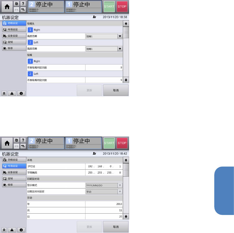 在机器设定中,可进行功能设定,动作及装置相关的参数调整,各种设定更改,机器数据的备份及恢