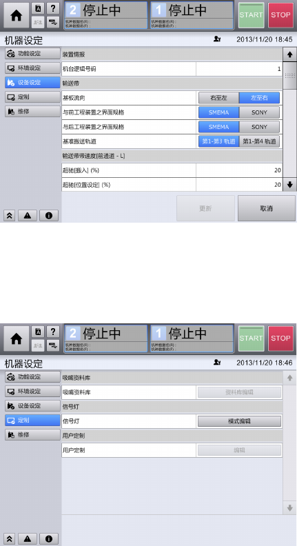 在自定义画面中,可对吸嘴资料库,信号塔,用户自定义等设定进行更改。
