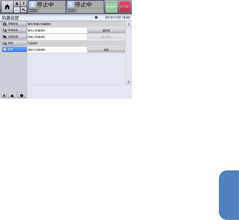 在保养画面中,可进行机器数据的备份,恢复,日志的保存等。