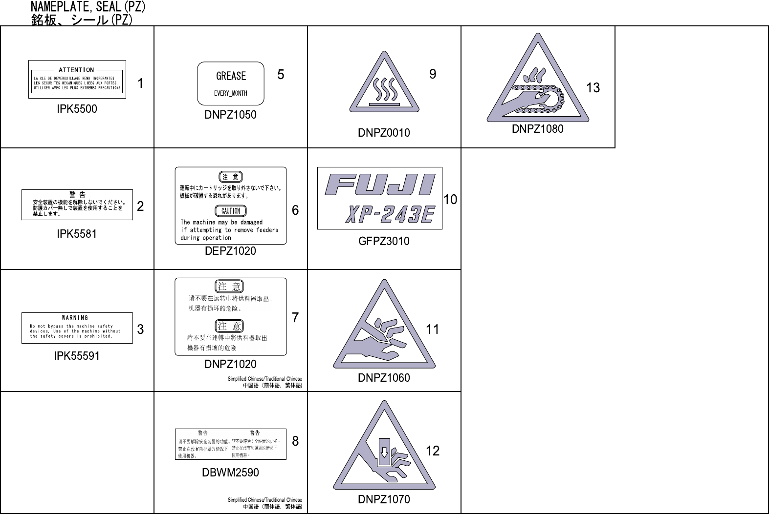 NAMEPLATE,SEAL(PZ) 銘板、シール(PZ) No. Drg.No. & Code No. QTY Description Rating Materials Remarks 番号 図番 & コード番号 個数 品名 規格 材質 備考 1 IPK5500 2 SEAL シール PL 2 IPK5581 2 SEAL シール PL 3 IPK5591 2 SEAL シール PL 5 DNPZ1050 8 SEA…