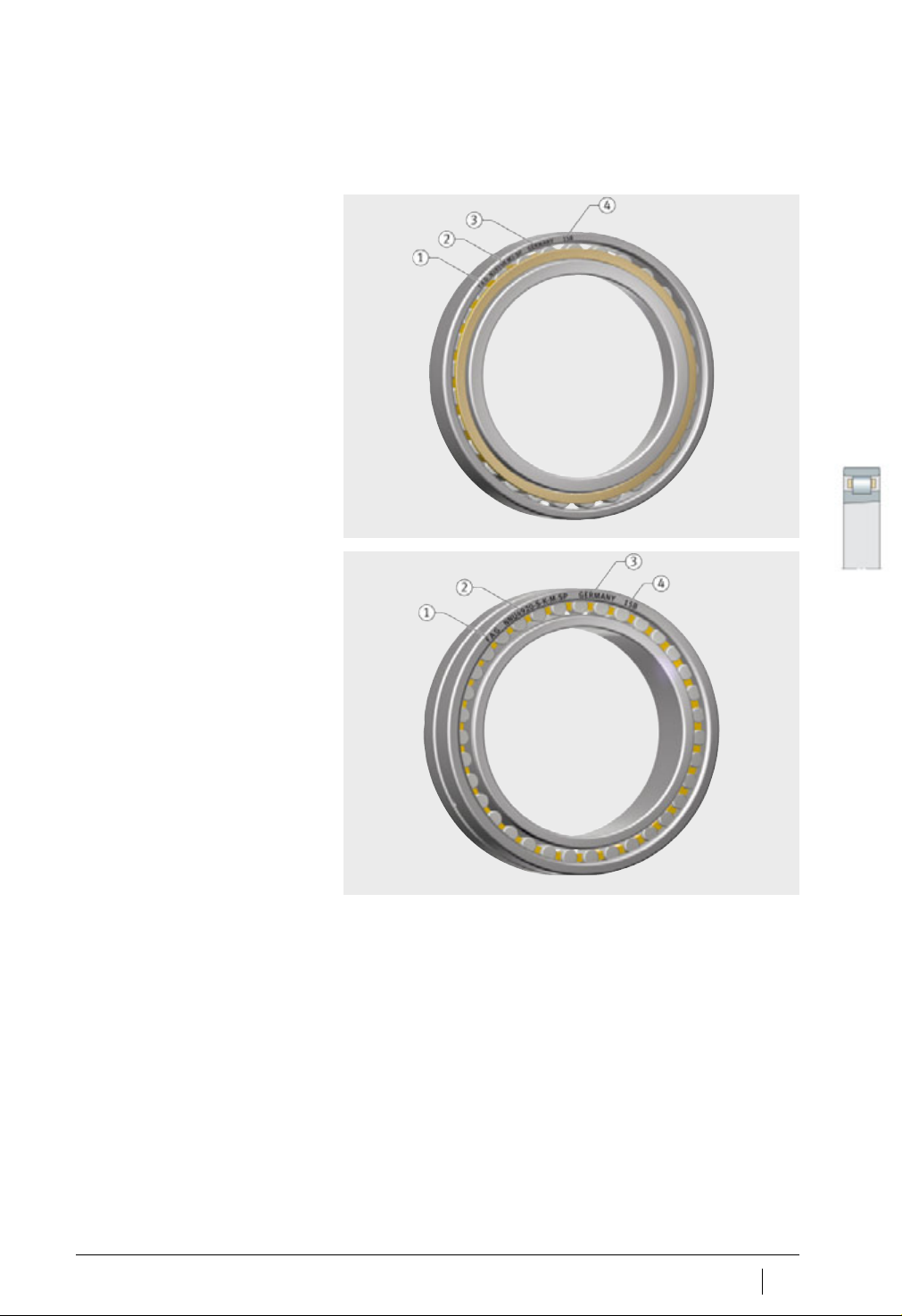 Schaeffler Group Industrial SP 1 167 轴承的标识 轴承套圈端面上的轴承标识如 图 6 和 图 7 所示。 商标 短型号 (轴承型号) 生产国 内部代码 图6 单列轴承标识 00016C58 商标 短型号 (轴承型号) 生产国 内部代码 图7 双列轴承标识 00016C59