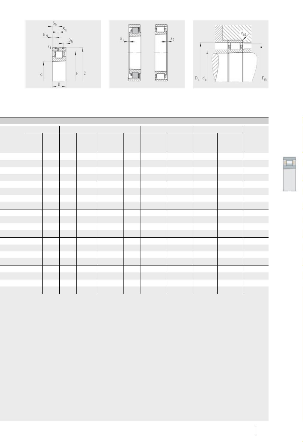 188 SP 1 Schaeffler Group Industrial 超精密 圆柱滚子轴承 单列 钢质或陶瓷滚子 N10 、 N19 钢质滚子 HCN10 陶瓷滚子 00016BE3 00016BE4 1) 2) 也提供热稳定性设计 (后缀 TR ) ,如: N1017-K - TR-PVPA1- SP 。 3) 轴向位移。 4) 最小油量润滑。 尺寸表 (续)· 单位:mm 型号 1) 质量 尺寸 标准型号 混合式,半数滚子 m …