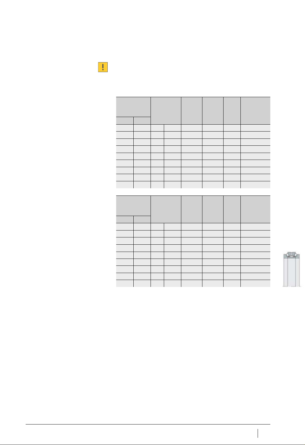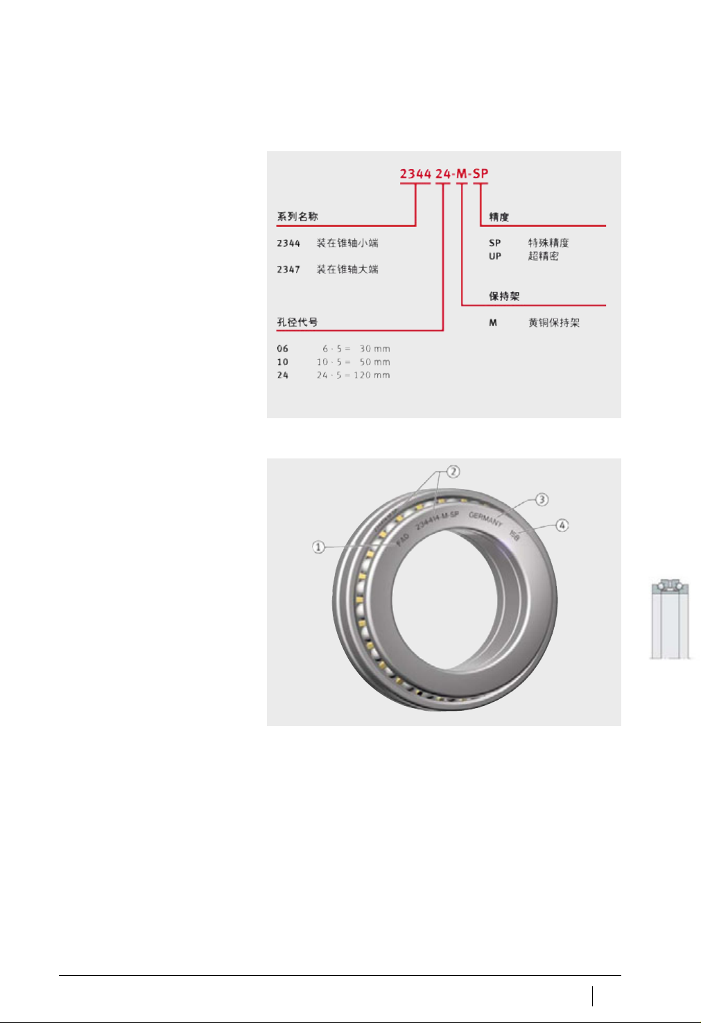 208 SP 1 Schaeffler Group Industrial 推力角接触球轴承 设计与安全指南 承载能力和工作寿命 采用双向推力角接触球轴承的轴承布置通常用于有高承载能力、 高刚度和精度要求的场合。 实践中,这些轴承出现疲劳引起失效的现象很少见。 因此额定寿命 L 10 的计算按照 DIN ISO 281 来确定工作寿命的 方法是不准确的。 轴承当量静载荷 角接触球轴承只承受轴向载荷。 对于承受静载荷的轴承,采用下式: P …