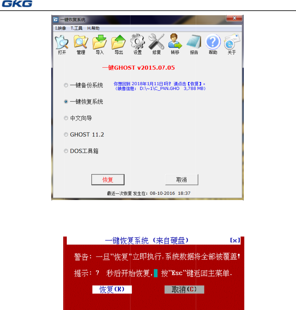 备份了系统,该软件将自动选择“一键恢复系统”选项,点击“恢复”按钮,系统重启,进