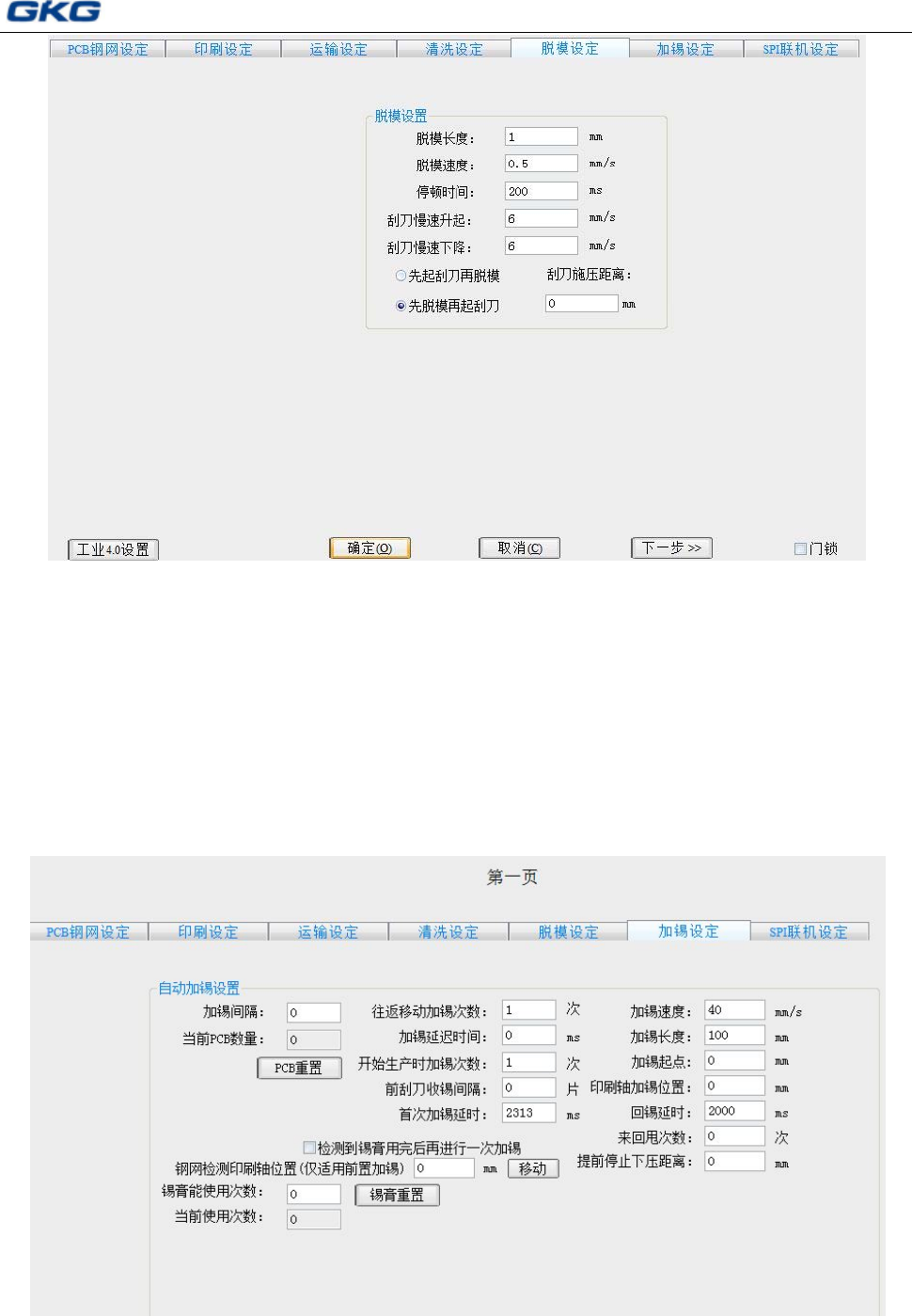 脱模设定:脱模长度、脱模速度、停顿时间、刮刀慢速升起以及刮刀慢速下降,用