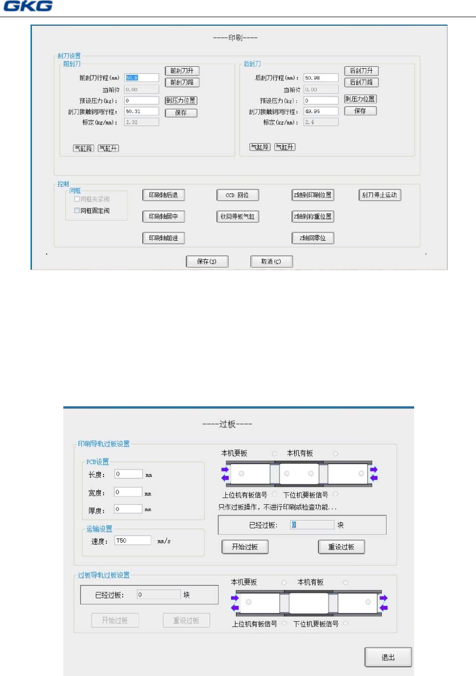 刮刀设置栏:主要设置刮刀行程、刮刀的标定、刮刀接触钢网行程等。