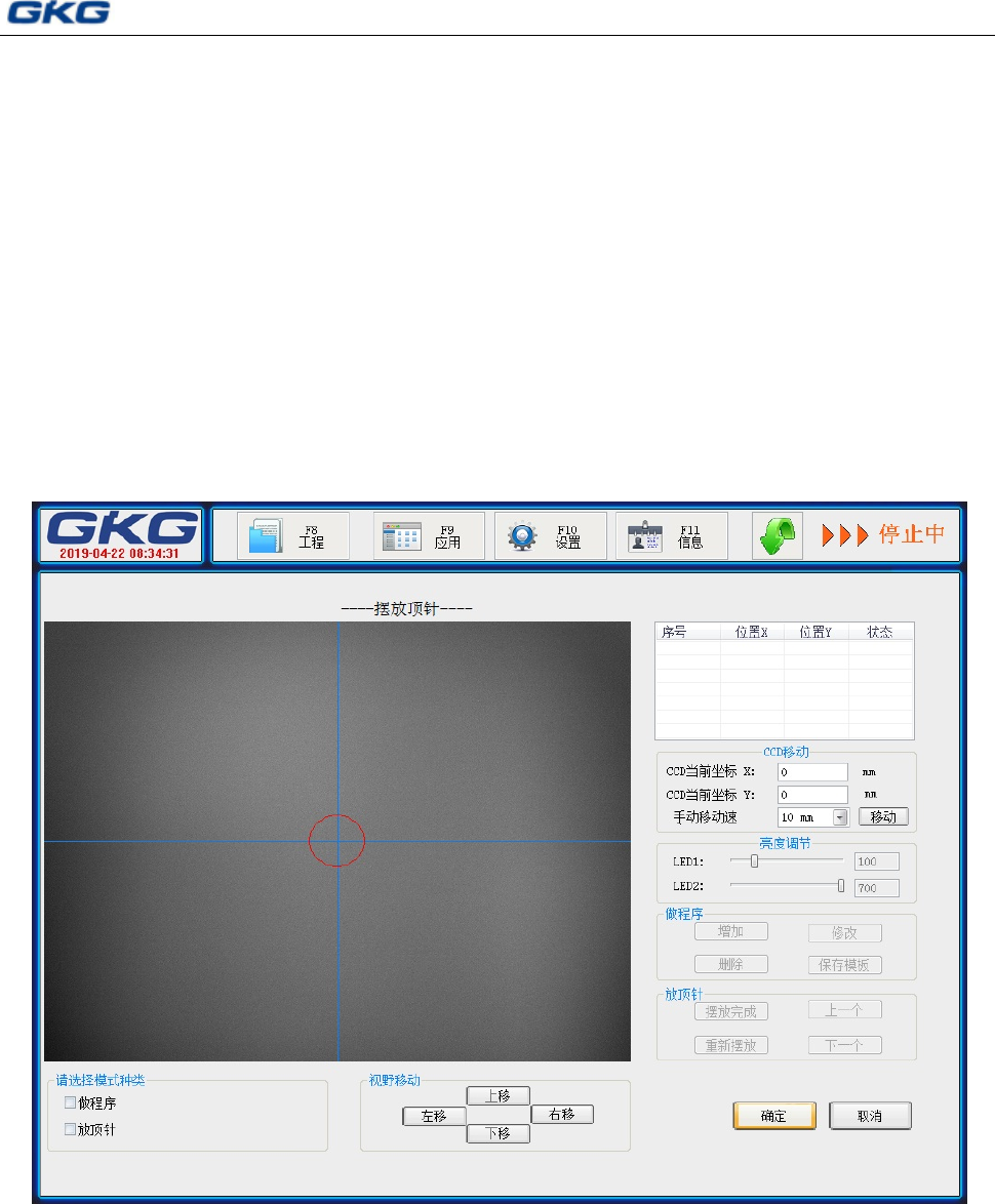 击“增加”按钮,调节好 LED 灯方便实时查看图像,然后移动 CCD,使其中心位 置刚好