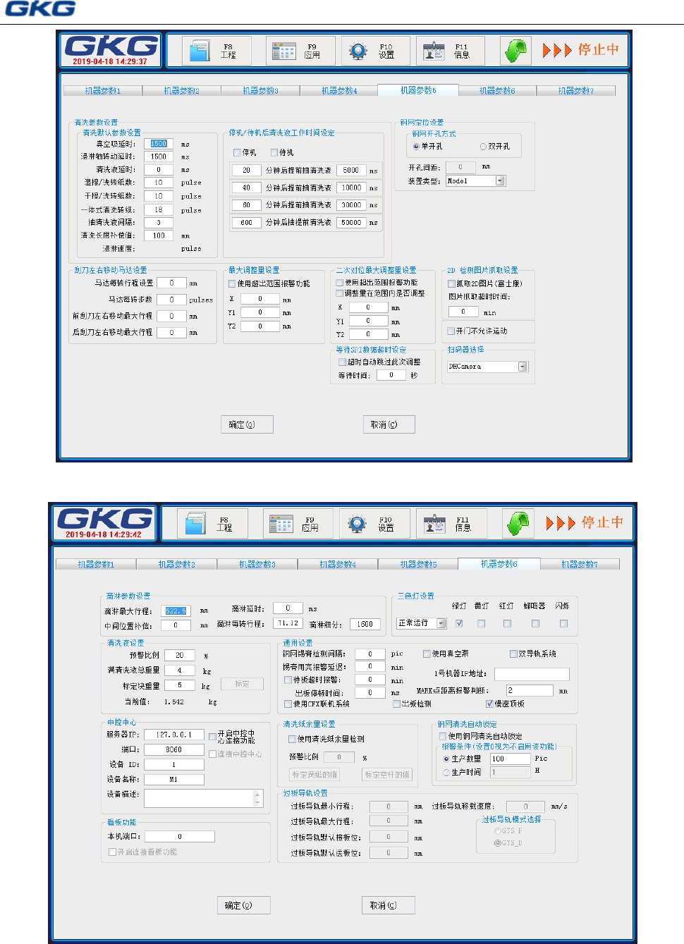 [机器参数 6]:滴淋参数设置、清洗液设置、中控中心、看板功能、三色灯设置、通用设