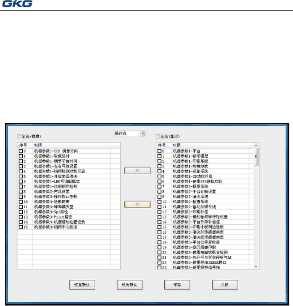 东莞市凯格精机股份有限公司 65 6.5.4 权限 单击主画面工具栏 3 中的 “权限” 图标按钮, 在主窗口显示 [ 权限管理 ] 对话框, 如图 6-50 所示。它包含四个权限,即操作员、技术员、工程师、原厂售后。 操作员:只能对生产操作,手动清洗,归零,复位进行操作; 技术员: 可以对除了机器参数 1~4 , 刮刀参数, SPC 工具, 模板自动校正以外进行 修改和操作; 工程师:可以对除了机器参数 1~2 以外进行修…