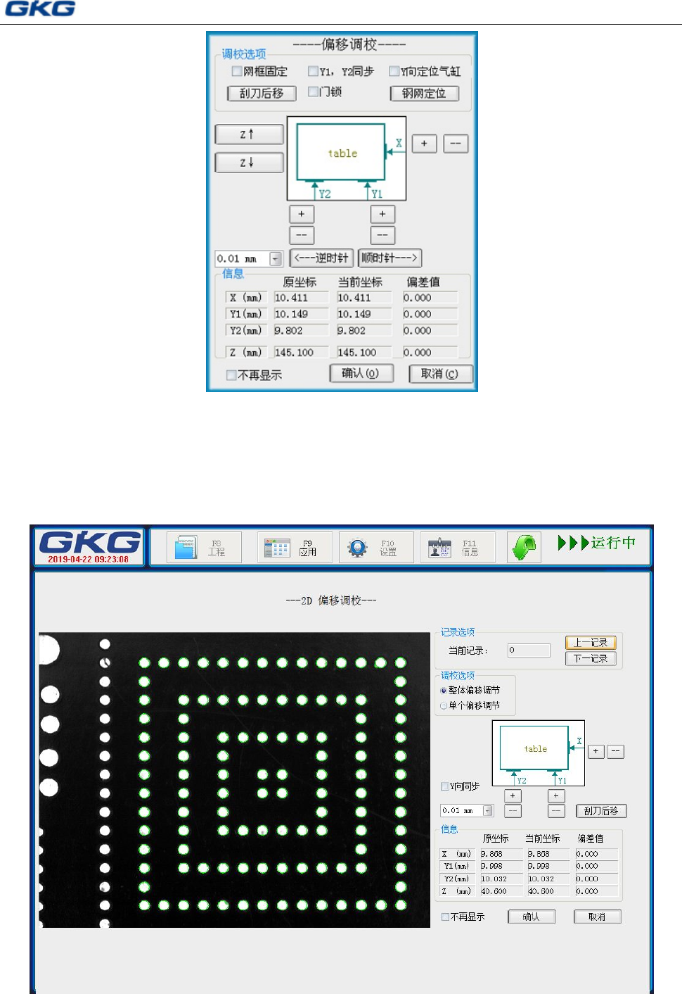 如果在[生产设置]界面上选中了“显示调节窗口”,待机器的运动状态为“偏移量调节”