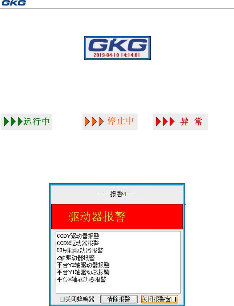 图 6-66〈运行中〉 图 6-67〈停止中〉 图 6-68〈异常〉