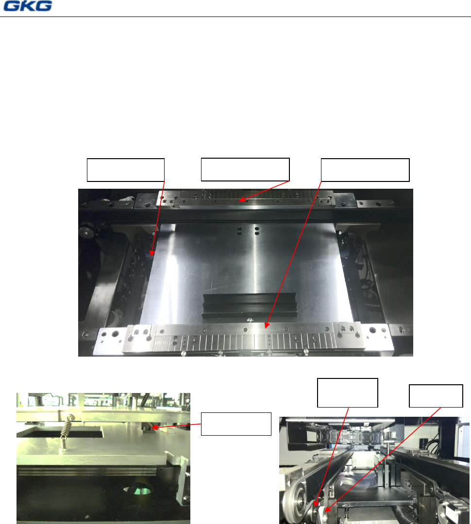 东莞市凯格精机股份有限公司 91 8.4.3.3 运输导轨 1) 检查侧夹机构是否运动平稳,检查侧夹机 构部位是否残留锡膏,必须经常进行清洁 润滑; 2) 检查运输导轨用于限位取像的阻挡螺钉磨 损情况,到取像位置时,两中间压板的平 面度,前后运输导轨的平行度; 3) 检查光电传感器是否正常; 4) 动导轨中间压板要求活动灵活,不能有残留锡膏,要进行检查与清洁; 5) 调整运输传送带的松紧; 6) 对进出板电眼进行清洁; 图 8-8 浮动…
