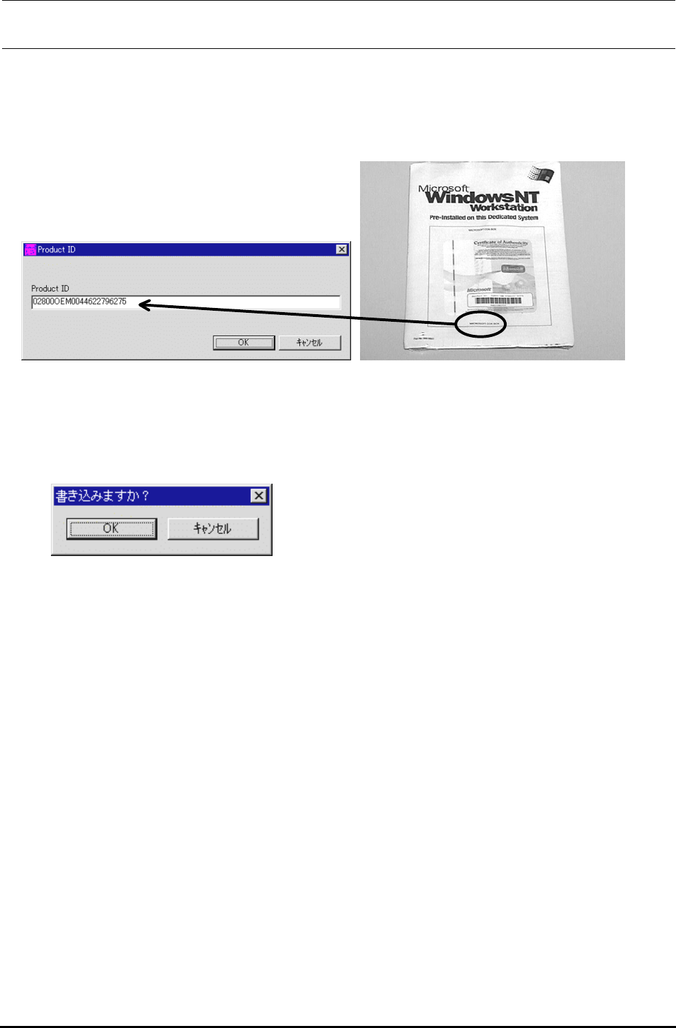 Rev1.00 维修调整要领书 3) 变成 ProductID 的输入画面,从装置附属的 Certificate of Authenticity 把 ProductID 抽掉 (−) 进行输 入 。 ※Certificate of Authenticity(Windows NT 的 Product ID 有记载 ) 在上图的纸或主机右侧非保险丝断 路器周围有记载 。 4) 按 「OK」 之后,下面的写入确认画面被显示 。 请选择 「OK…