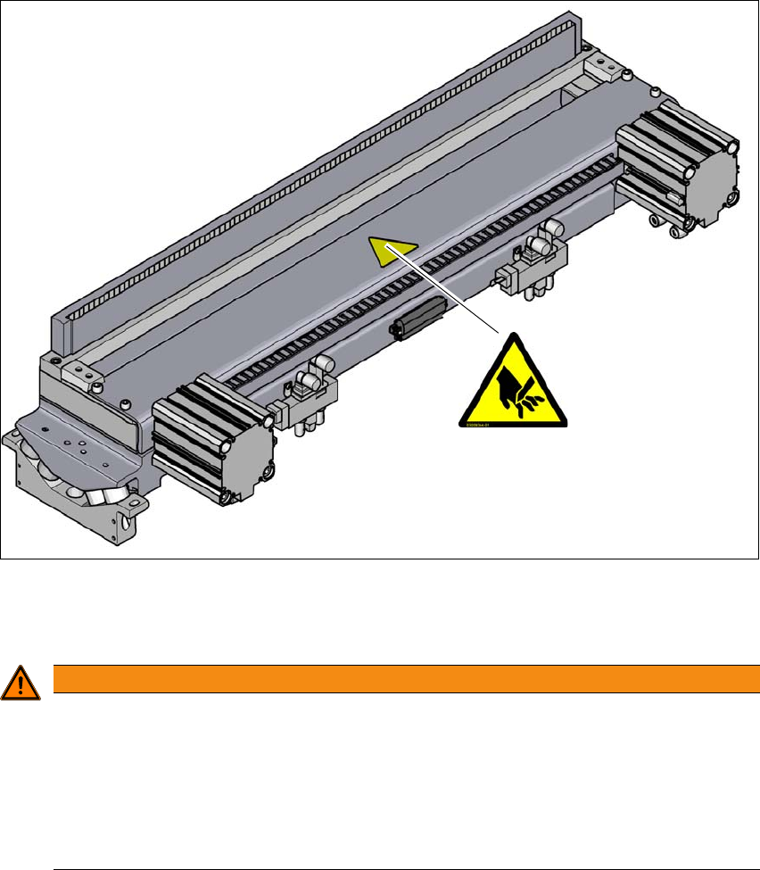 Fig. 2.2 - 4 Cartello di avviso W205 sul lato superiore del dispositivo di taglio della cinghia