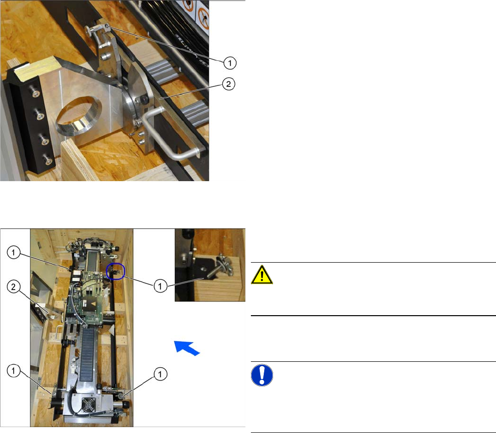 ► Lösen Sie jeweils 2 Befestigungsschrauben an den Transportsicherungen (2) an der Kopfplatte und