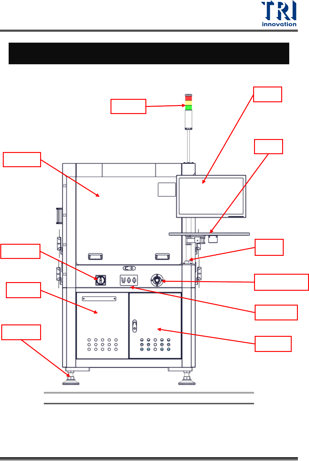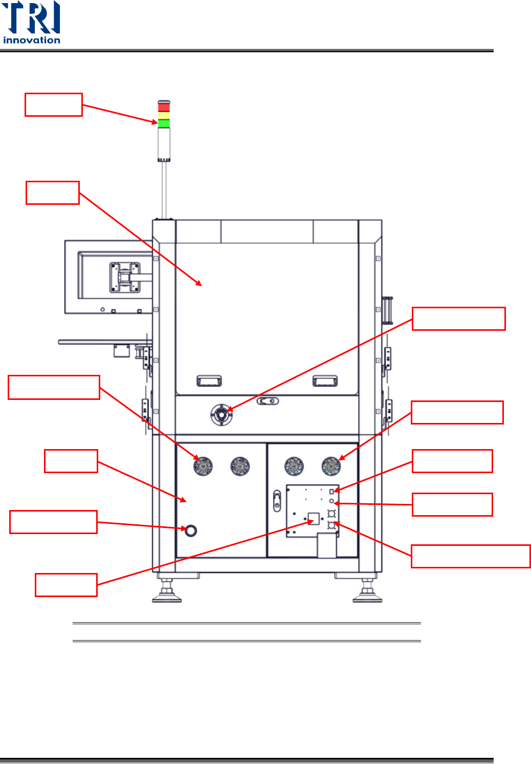 Test Resear ch, Inc. 6 TR7710 User Guide – Mainten ance 1.2 背面 圖 2 : TR 7710 機台 後視圖 後上門 後左下風扇 組 後下門 氣壓控制器 後右下風扇組 緊急停止按鈕 斷路器 前後 (I/O) 站連接埠 主電源插座 網路連接埠 三色燈