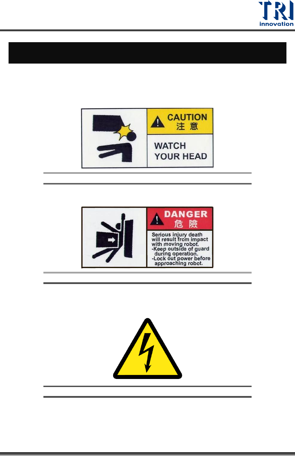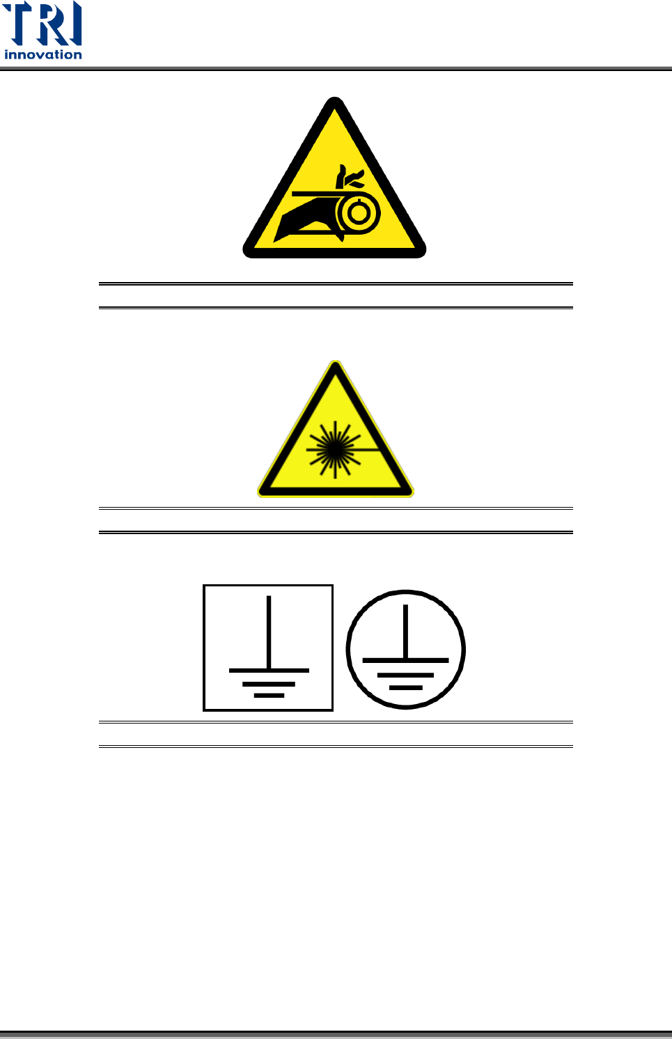 Test Resear ch, Inc. TR7710 User Guide – Maintenanc e 13 2 安全標示說明 為保護人員安全與機器 運作的順暢 ,在機台上會 貼有安全標 示告知使用者 須注意的地 方。以下 為各個不同安全標示的 說明。 機械警示 (M echanical Caution) :注意機械 裝置移動或接近 造成的傷害。 圖 9 : 安全標籤 – 機械警 示 機械危險 (M echanical Da…