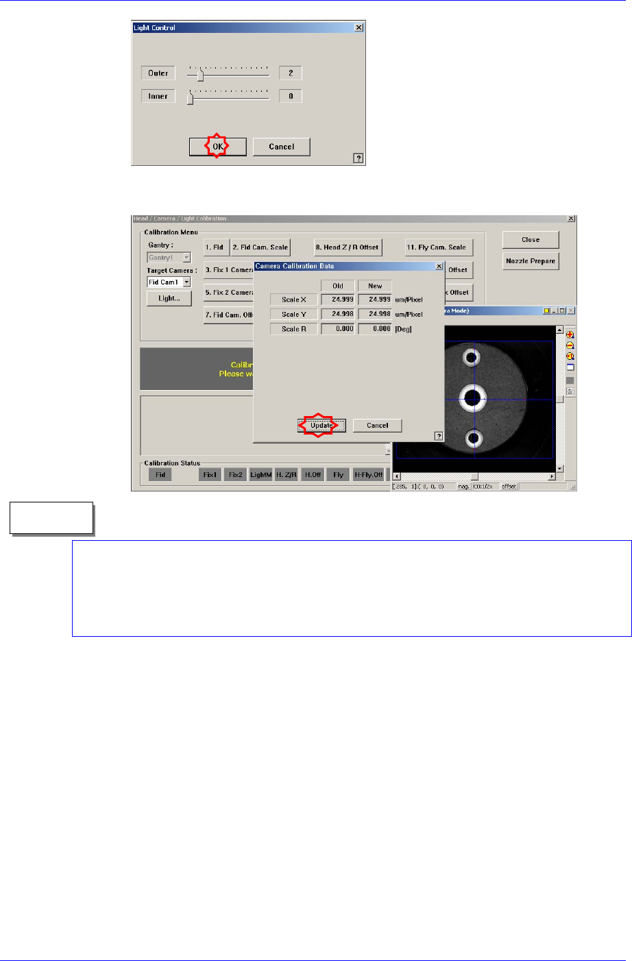 Calibration 3-13 为校正 Fiducial Camera 的 Scale(um/pixel) 和 Rotation(deg) 没有预先需要执行的 校正。为进行此作业不需要特制的器具,利用 ANC 上面的 fiducial mark 即 可。 下面是 Fiducial Camera(Fiducial Camera) 的校正步骤 1. 请点击 < 标准菜单 > 领域的 <1. 凸轮比例 > 按钮。 2…