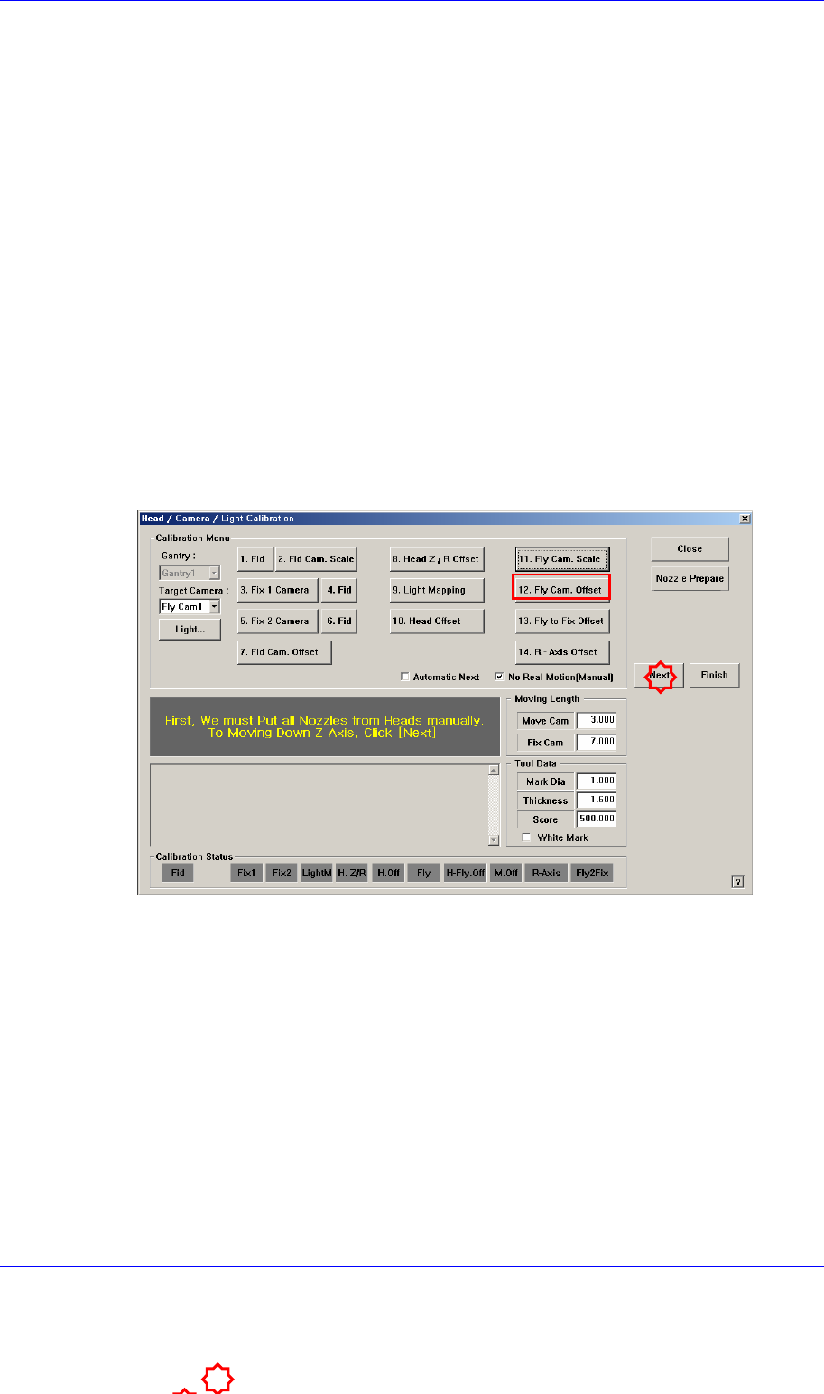 下执行校正时,虽然对当前被选的Head自动更换喷嘴,但要点击<Next>按钮才