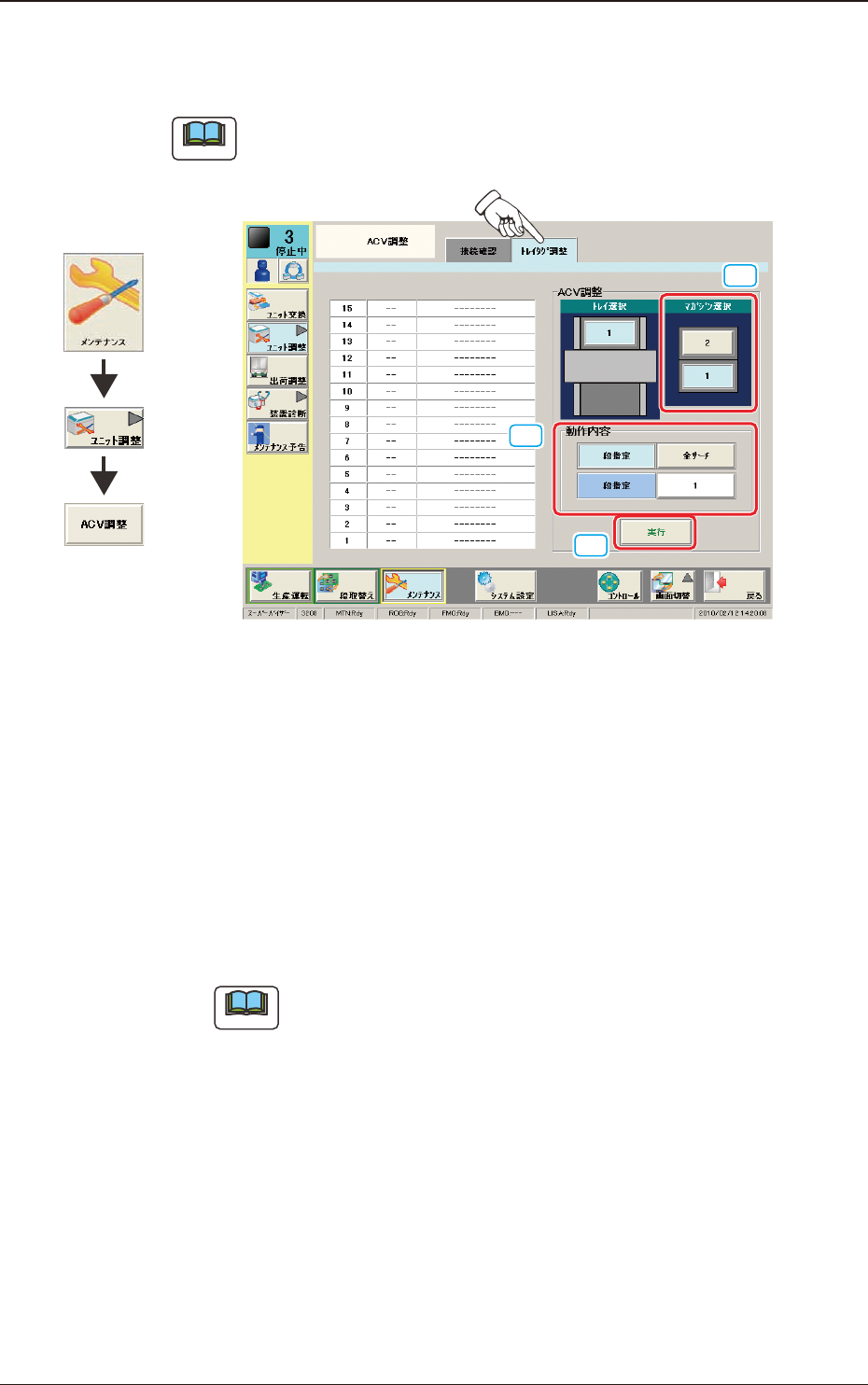 OM-1761 17 1303-001 7.2.2 トレイタグ調整 タグアンテナによるタグメモリの読取り確認を行います。 ノート この機能を使用するには、 別途タグメモリ付パレット ( 多段トレイフィー ダ ) のオプションが必要です。 [1] [2] [3] F5 [1] マガジン選択 タグメモリを読取るマガジンを選択します。 [2] 動作内容 [1] で選択したマガジンのトレイに対して段を指定するかすべてを読 取るかを選択します。 …
