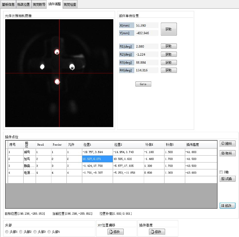 本选项页执 行插件位置的 调整操作。 在上一页面 , 对基准位置进行定位 后, 在本页面选 择插件点位, 进行 试插,当位 置有偏移时, 进行人工调整 。 插件等 待 位置 :第 一个 按键 插件 点位 的 XY 位置和 四 个插 件点 位的 R 轴位置,设 定这些参数的 作用是为了提 高插件效率, 减少等待时间 。 5. 视觉检查