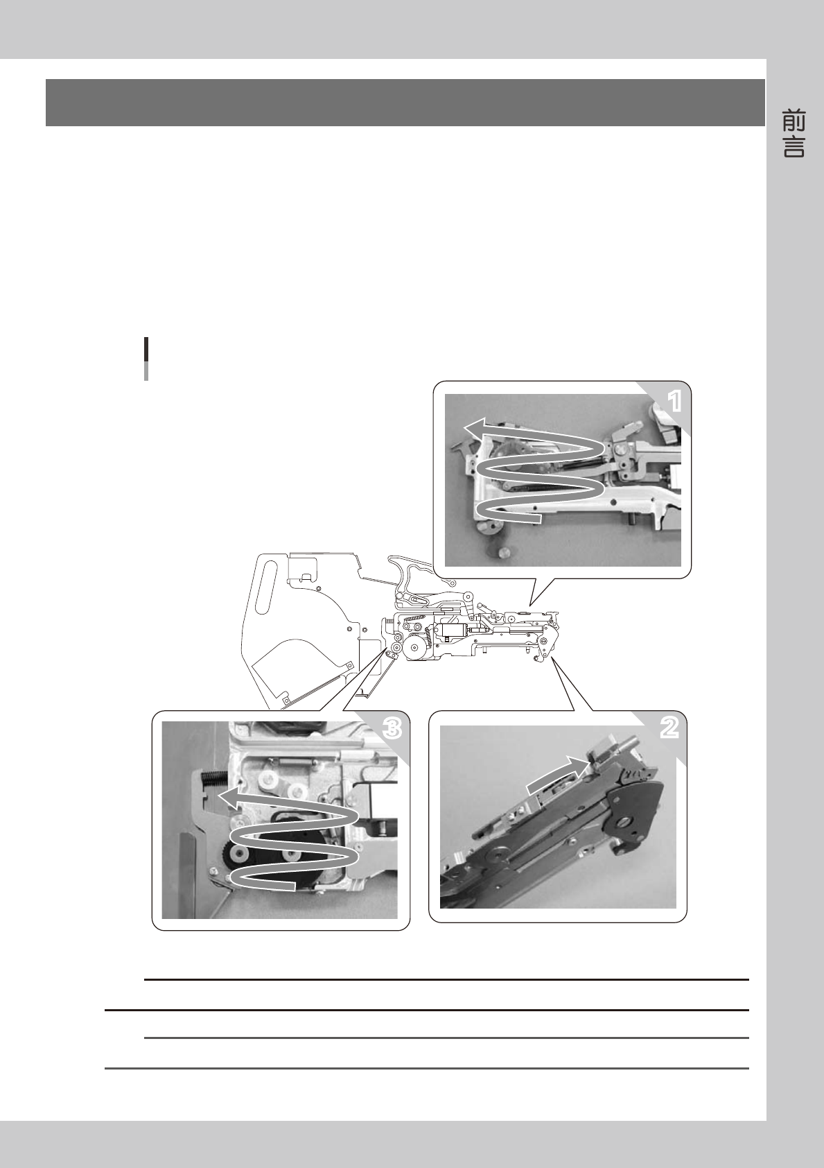iii 3. 使用注意事项 为了保证机器的性能,使用时务必注意以下事项。 ■更换元件时进行喷气排屑,需注意的事项 更换元件前必须对下述部位进行喷气排屑。 · 滑板开关内侧和传送齿轮部 ( 下图 1) 对整个滑板开关内侧和传送齿轮进行喷气排屑。 · 空料带传送凹槽 ( 下图 2) 从箭头方向进行喷气排屑。 · 盖带卷绕齿轮部 ( 下图 3) 对整个盖带卷绕齿轮进行喷气排屑。 更换元件时的喷气排屑位置 1 2…