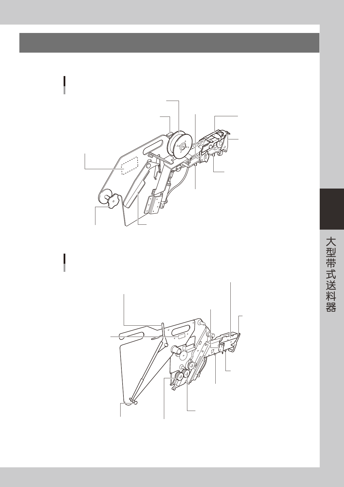 4-2 4 2. 大型带式送料器的种类 大型带式送料器根据料带的宽度和规格,CL 型分为 4 种、FV 型分为 9 种类型。 ● 大型带式送料器的种类 (CL 型 ) C L 型 种类 ( 料带宽度 ) 传送间距 (mm) 24mm 24 带式送料器 4 、 8 、 12 、 16 、 20 、 24 32mm 32 凸型载带送料器 4 、 8 、 12 、 16 、 20 、 24 、 28 、 32 44mm 44 带式送料…