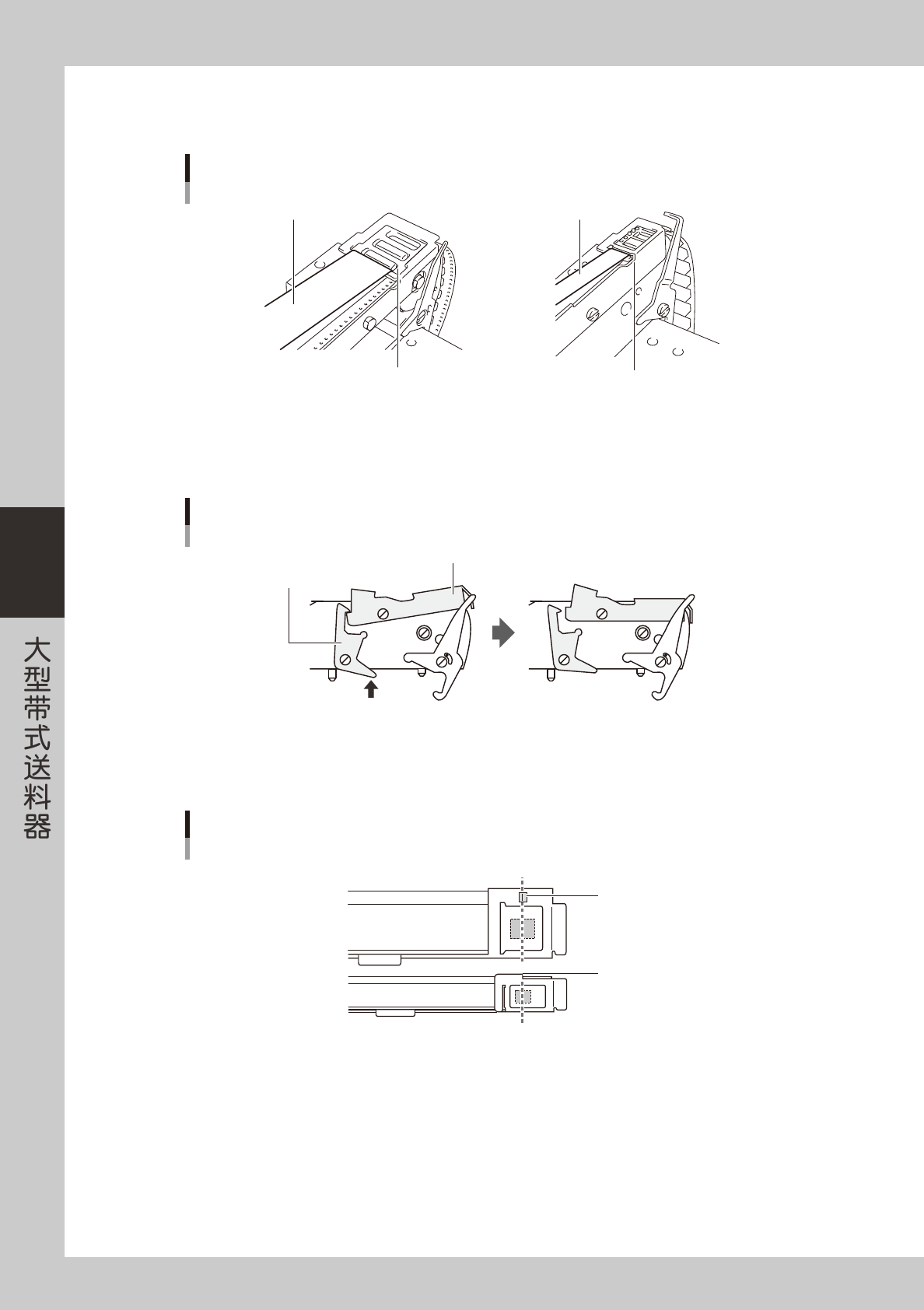 4-13 4 按住压接滚轮杆,将盖带夹入驱动滚轮组件与压接滚轮组件之间。 驱动滚轮组件和压接滚轮组件 驱动滚轮组件 压接滚轮组件 65417-90-00 32mmPSA、44mmPSA、56mm 带式送料器的卷绕滚轮在送料器上部。拧松卷绕滚轮的两颗固定螺钉, 拆下侧板,将盖带夹入卷绕滚轮的压带处。再按相反的步骤固定侧板。 32mmPSA、44mmPSA、56mm 带式送料器盖带的处理 压带处 卷绕滚轮 固定螺钉 侧板 65418-9…