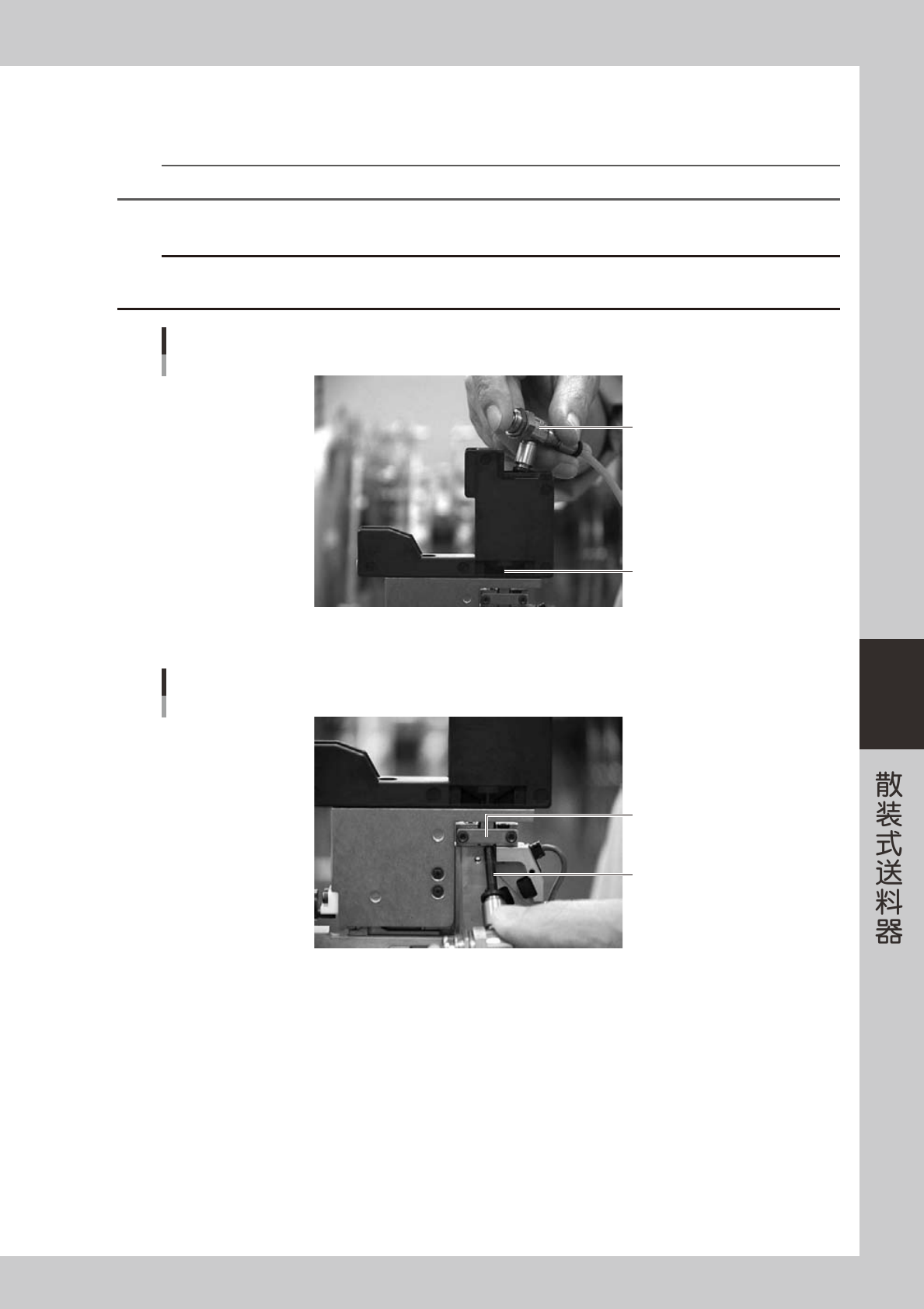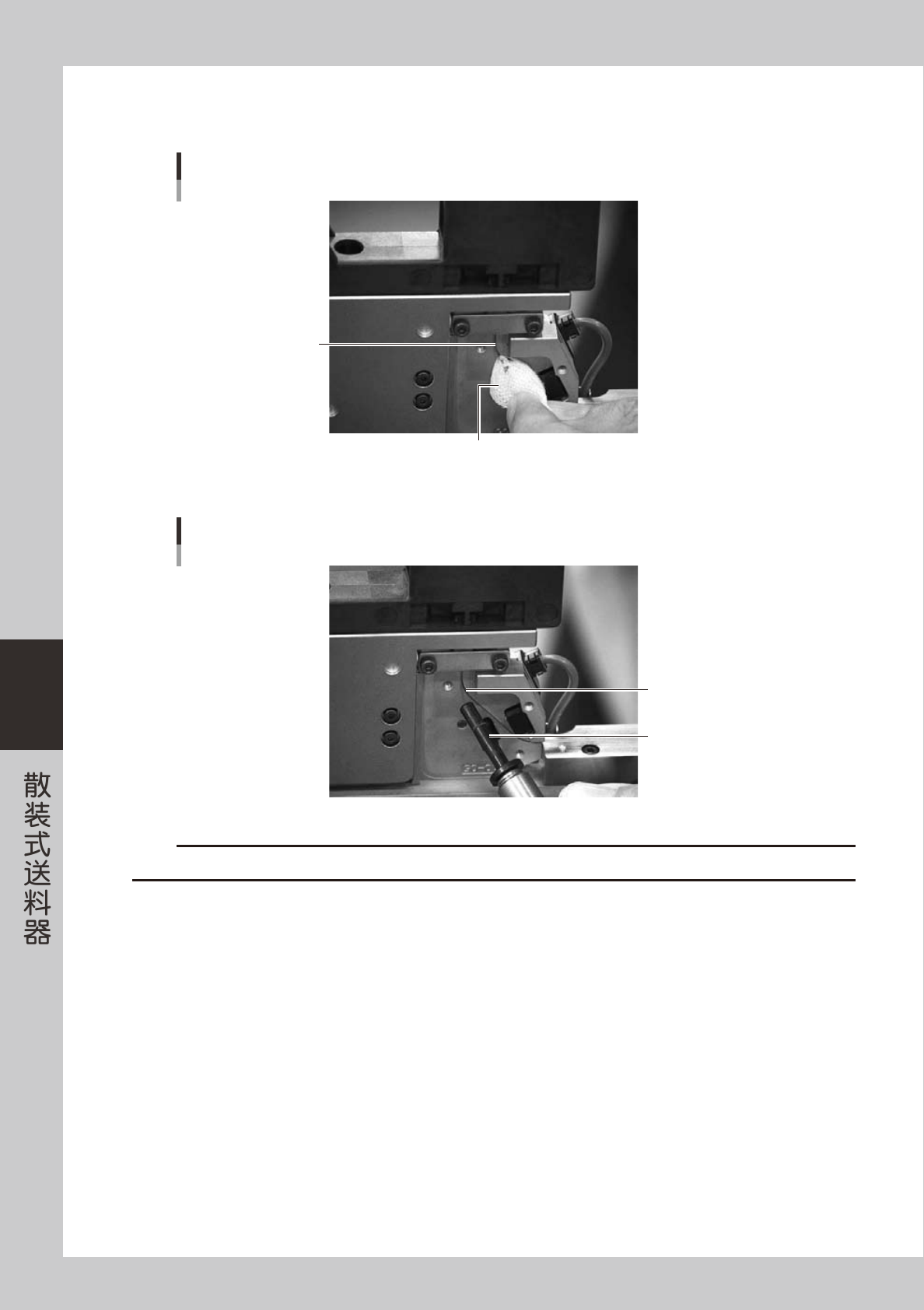 5-17 5 5 清洁分离管部。 1. 将喷气工具的金属接头换为 φ4×60mm 的输气管。 n 要点 将附属的 Φ4 输气管切为长 60mm 左右后使用。 2. 将输气管插入散料盒支架内的分离管,进行喷气排屑。 c 注意 分离管尺寸较大时,输气管无法插入。此时,可以将输气管抵在分离管的口部进行喷气排屑。  但,务必注意切勿用力过大,因为用力过大可能会使分离管变形。 分离管的喷气排屑 分离管 喷气工具 65517-90-00 3…