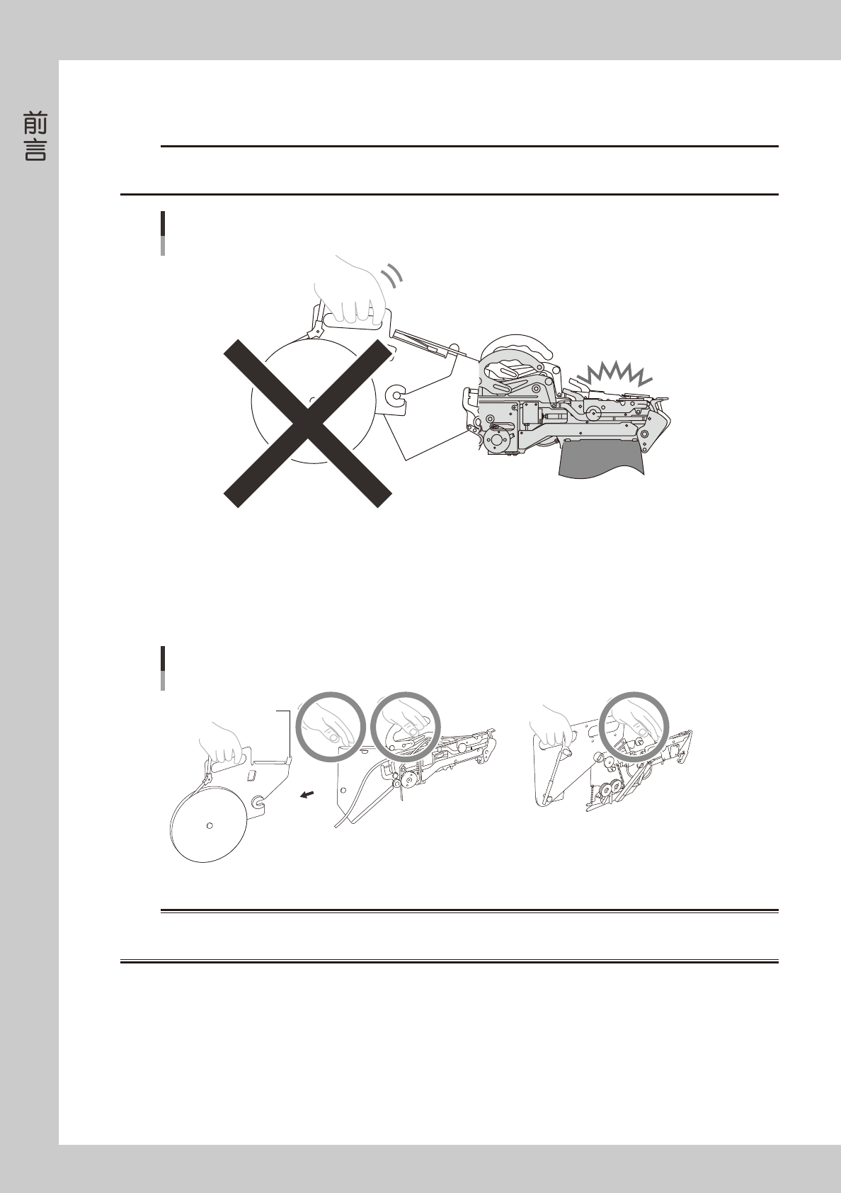 在运行过程中,如不按住送料器部就卸下料带拼接器 ( 装有料带拼接器的 CL 型 ) 或料带盘支架 (FV 型 ),会导致送料器浮起,造成