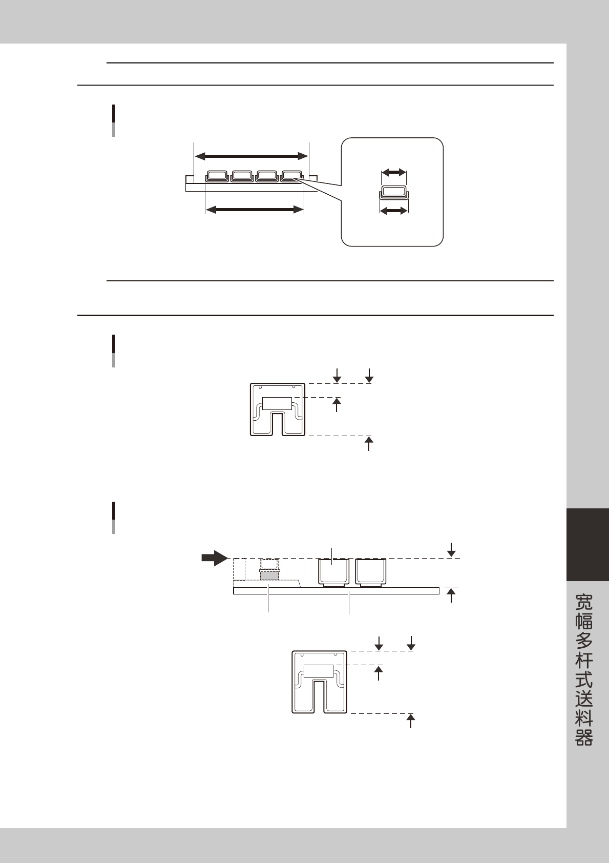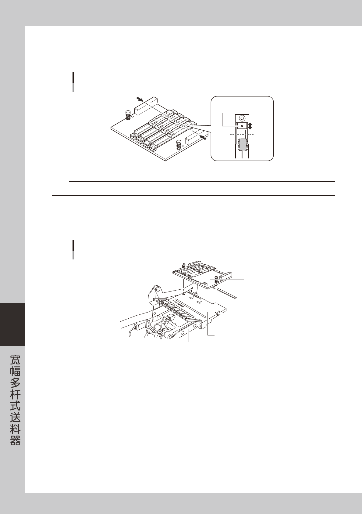 6-4 6 2 调节挡板的位置。 如下图所示,连线的位置为元件的吸附点。 旋松传送轨背面的螺钉,调节挡板,使元件中心对准吸附点。 吸附点 线 挡板 吸附点 吸附点 65606-90-00 c 注意 元件长度不能超过 36mm。如超过 36mm,即使送料器运行,元件也不会被传送。 3 将安装板安装在宽幅多杆式送料器机体上。 将传送轨安装在安装板后,将安装板上的固定旋钮对准底板上的定位孔安装。边按固定旋钮边旋转 90 度 加以固定。 …