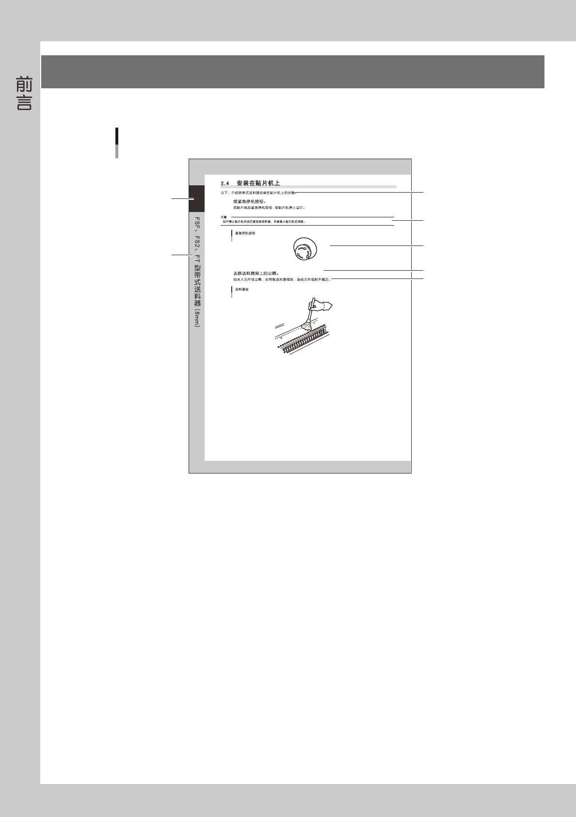 xi  4. 各章内容 第 1 章FS、FS2、FT 型带式送料器 介绍 FS、FS2、FT 型带式送料器的概要、元件的安装、各部的调整、故障的排除等方法。 第 2 章CL 型带式送料器 介绍 CL 型带式送料器的概要、元件的安装、各部的调整、故障的排除等方法。 第 3 章FV 型带式送料器 介绍 FV 型带式送料器的概要、元件的安装、各部的调整、故障的排除等方法。 第 4 章大型带式送料器 介绍大型带式送料…