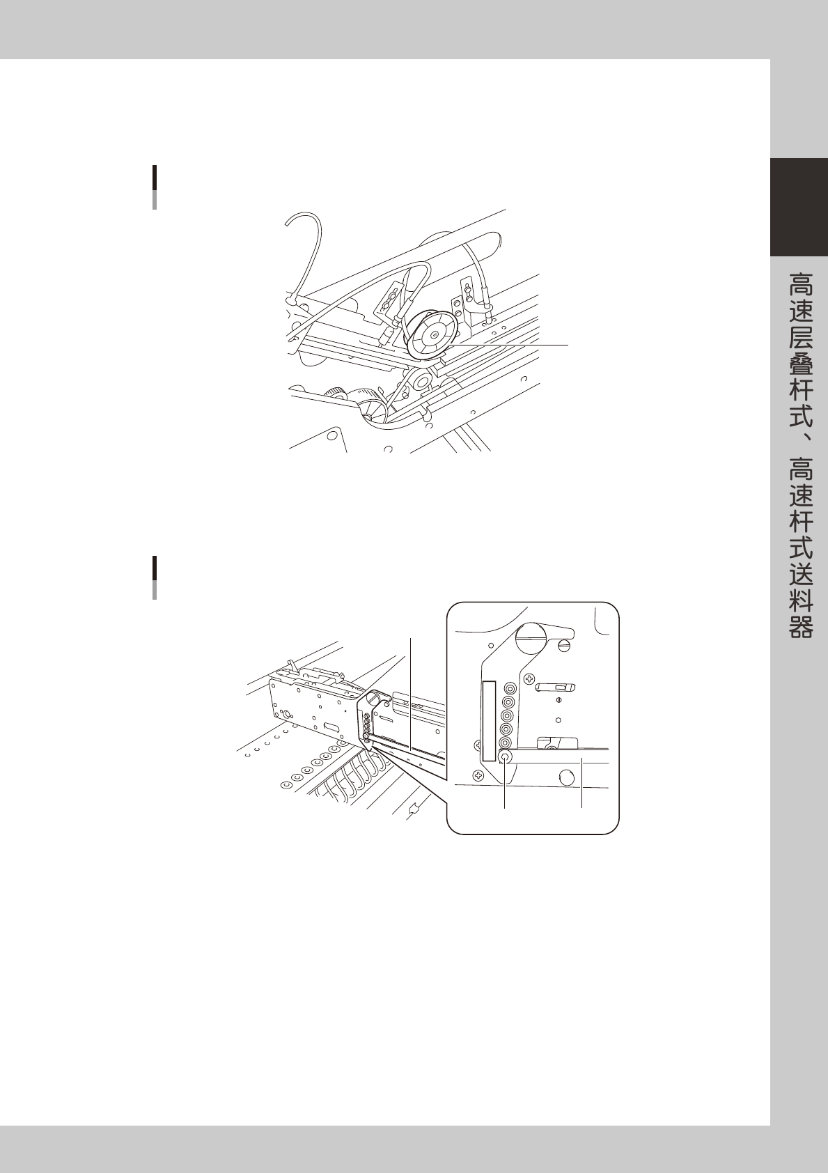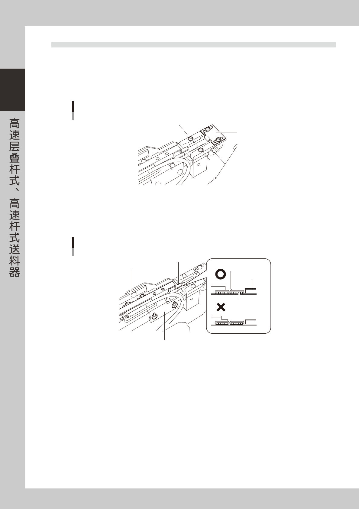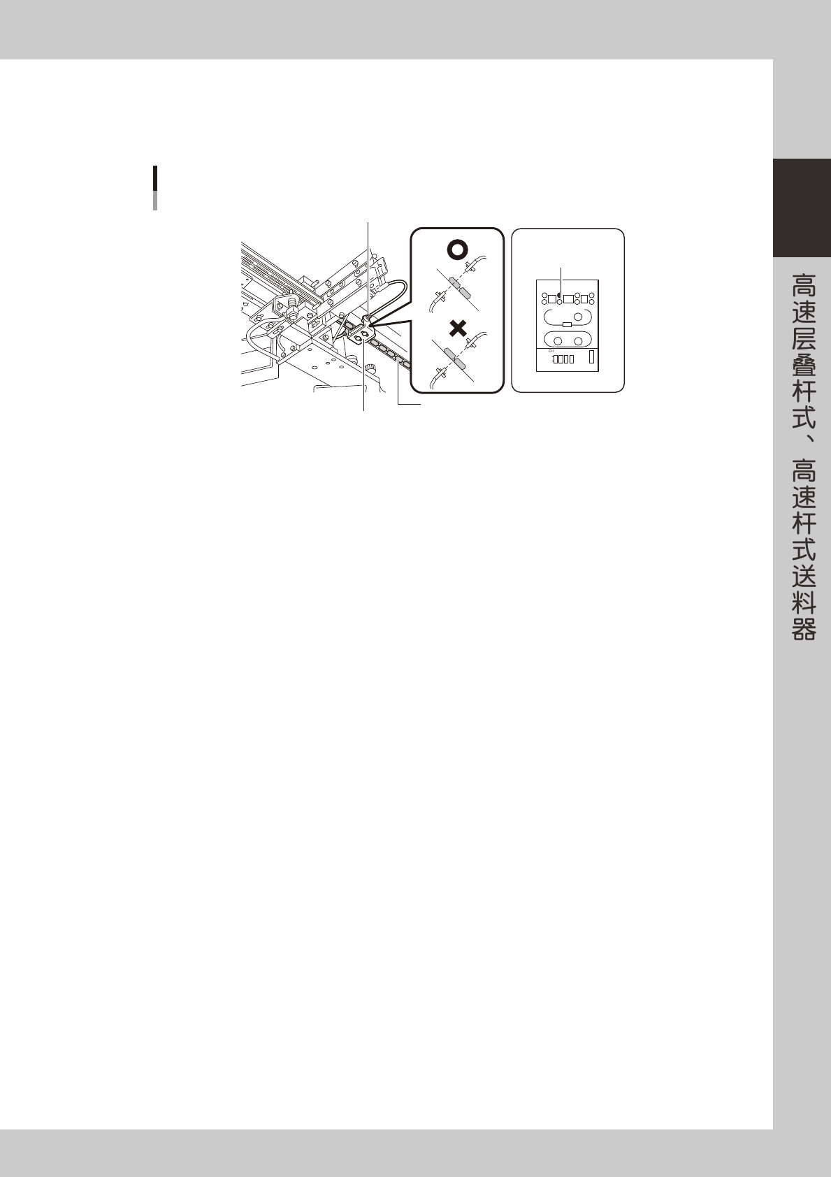 7-20 7 3.6 送料部的调节 按照下列步骤,调节供给元件的送料部。 1 调节挡板位置。 如下图所示,2 颗螺钉所在直线的中心位置为元件的吸附点。 调节挡板,使元件的中心与吸附点在一条直线上。 吸附点 吸附点 挡板 65730-90-00 2 调节滑板开关。 滑板开关可以前后滑动。调节滑板开关的前后固定板,使滑板开关滑向前侧时,滑板开关前端可以 盖到第 1 个元件上。调整滑板开关的上下固定板,使元件与滑板开关之间保持 0.…