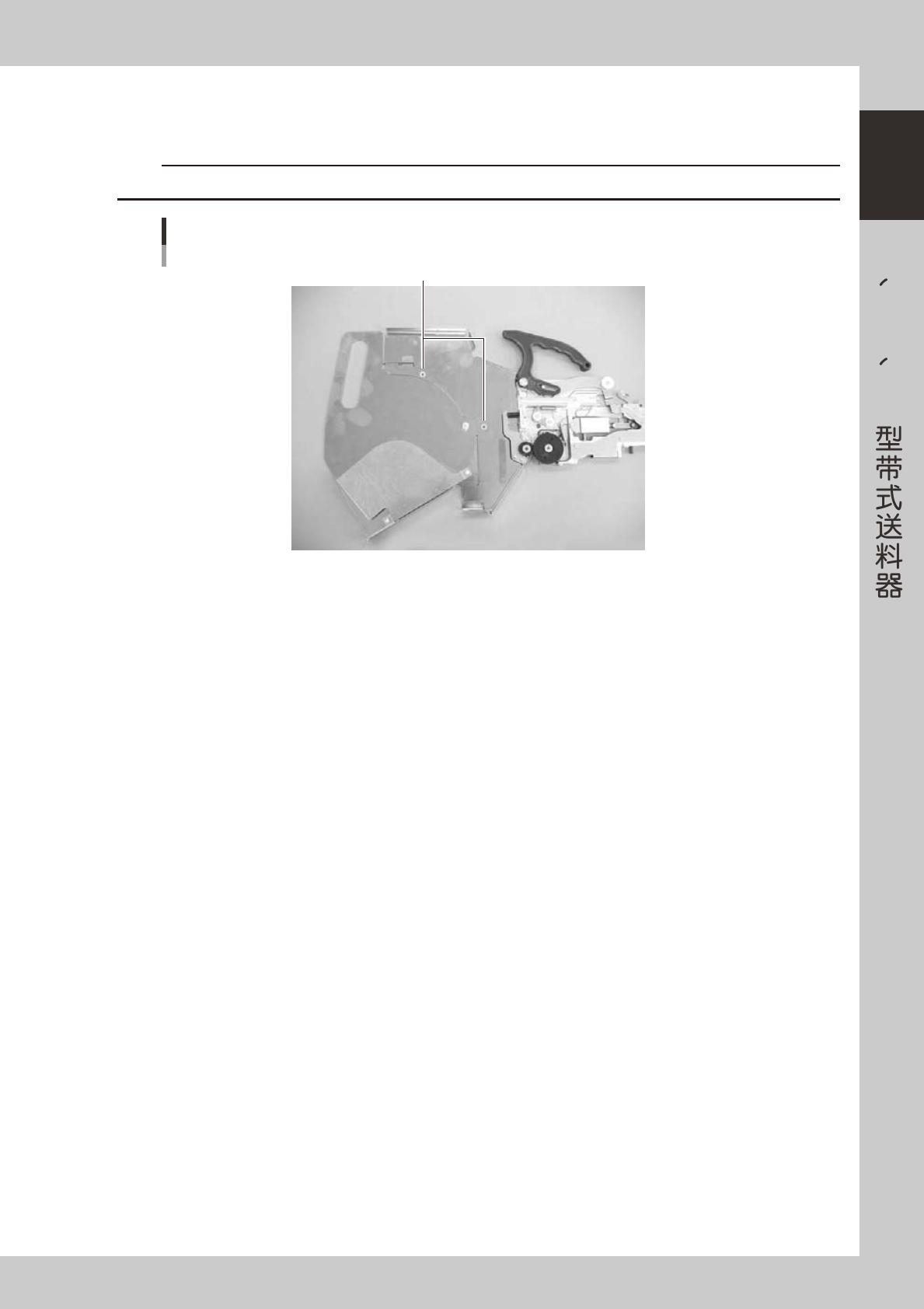 1-2 1 FSF FS2 FT (8mm)  2. 送料器的准备 为了使送料器能够准确地供给元件,使用之前必须准备并调整好送料器。 2.1 料带盘支架的安装(仅限 FS) 开箱后,将料带盘支架按下述步骤安装在送料器机体上。 1 组装送料器机体与料带盘支架。 将送料器机体与料带盘支架分别嵌入各切口部。  安装时注意对准各自的螺钉孔。 料带盘支架的安装 料带盘支架 螺钉孔 螺钉孔 挂钩部 挂钩部 65101-90-00