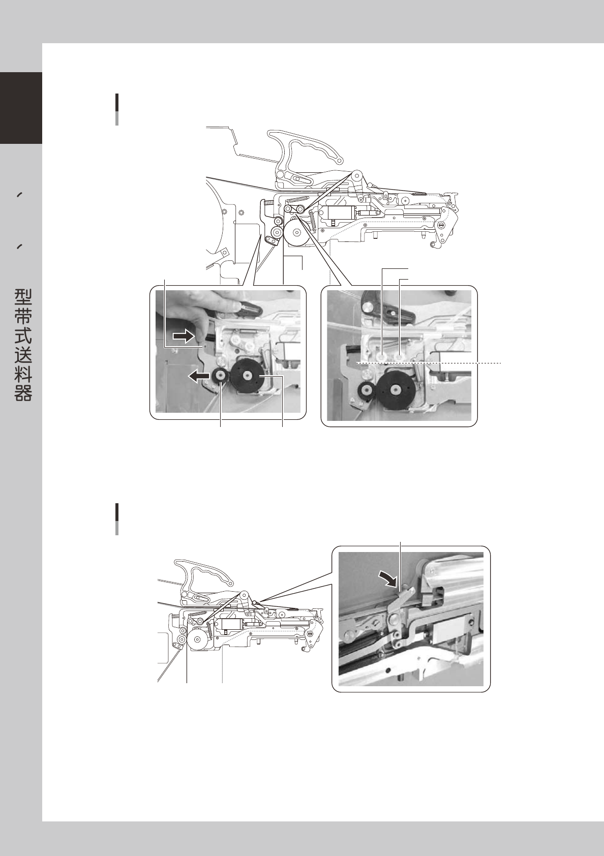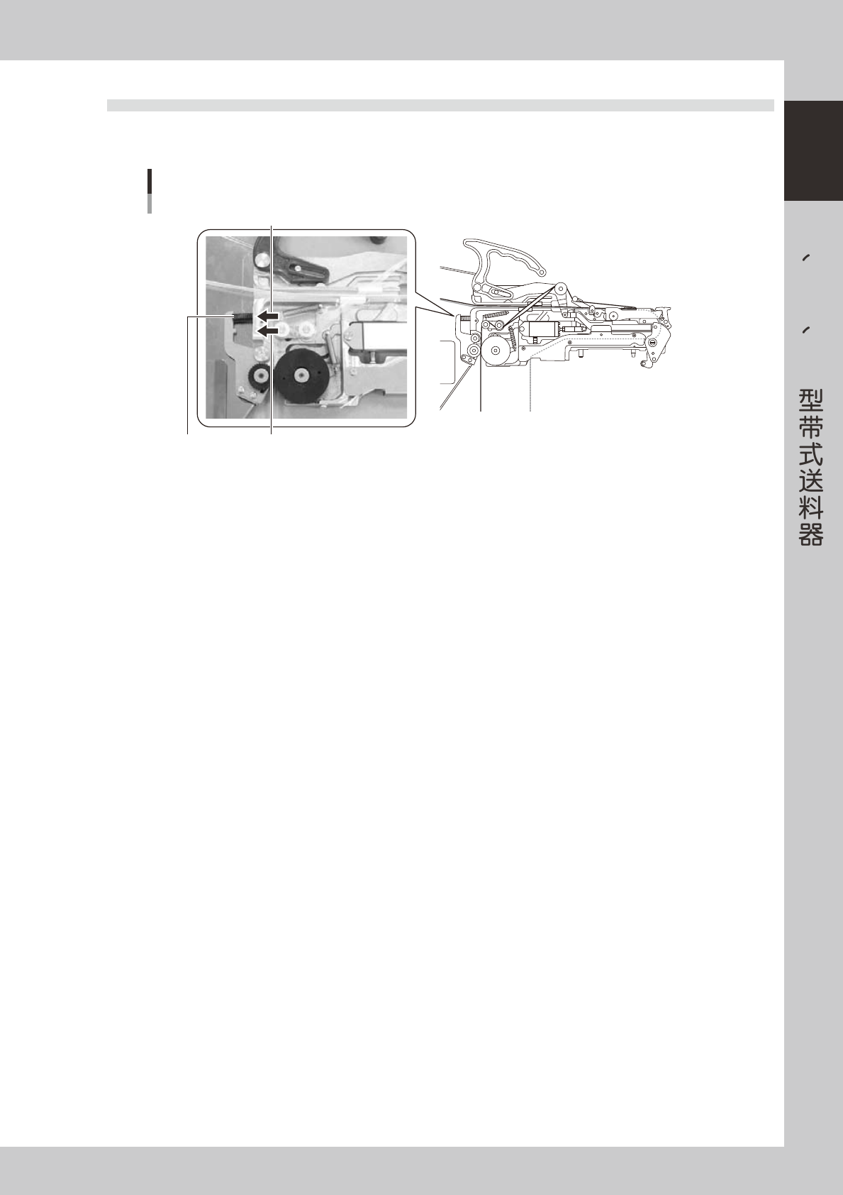 安装完料带后,按盖带剥离杆的弯曲部,将元件传送至吸附位置。
